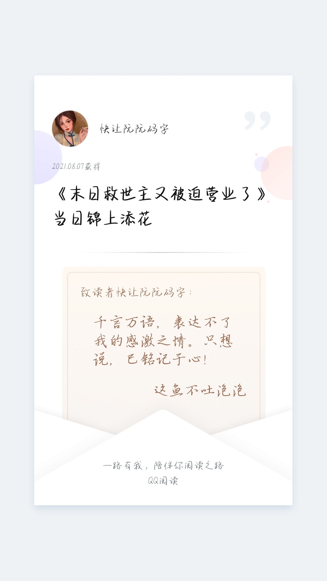The new book period is about to end in about a week. Regardless of the past, regardless of what the future holds, Thank you to all the babies who support Yuyu! Hereby prepare a small activity, I hope I can give back to everyone π_π List Activity Time: August 9, 2021 0:00-August 15, 2021 23:59 Rules: Prizes will be awarded to the top ten active list members in the book club (weekly list~) 1. First to third place will be rewarded with 1,000 book coins 2. The fourth to sixth place will be rewarded with 800 book coins. 3. The seventh to ninth place will be rewarded with 500 book coins. 4. The tenth place will be awarded 300 book coins. Redemption time: The event ends (complete the redemption before 24:00 on August 16) Redemption method: You can redeem your prize by adding a skirt to the author, and you can choose any payment method. PS: A secret code will be given at the end of the chapter, so remember to enter the trap~ (Because the author did not draw character pictures or make various small things, I will not do peripheral activities such as pillows~) 2021-8-15 00:09 It's the last day~ Dear babies who have received the award, remember to join the group to find me to receive the award~ Those who make soy sauce, those who chatter, and those who send razors to the author are also welcome~ Please put the group number here, I'm π_π Password: 9#4#6#40#78#21