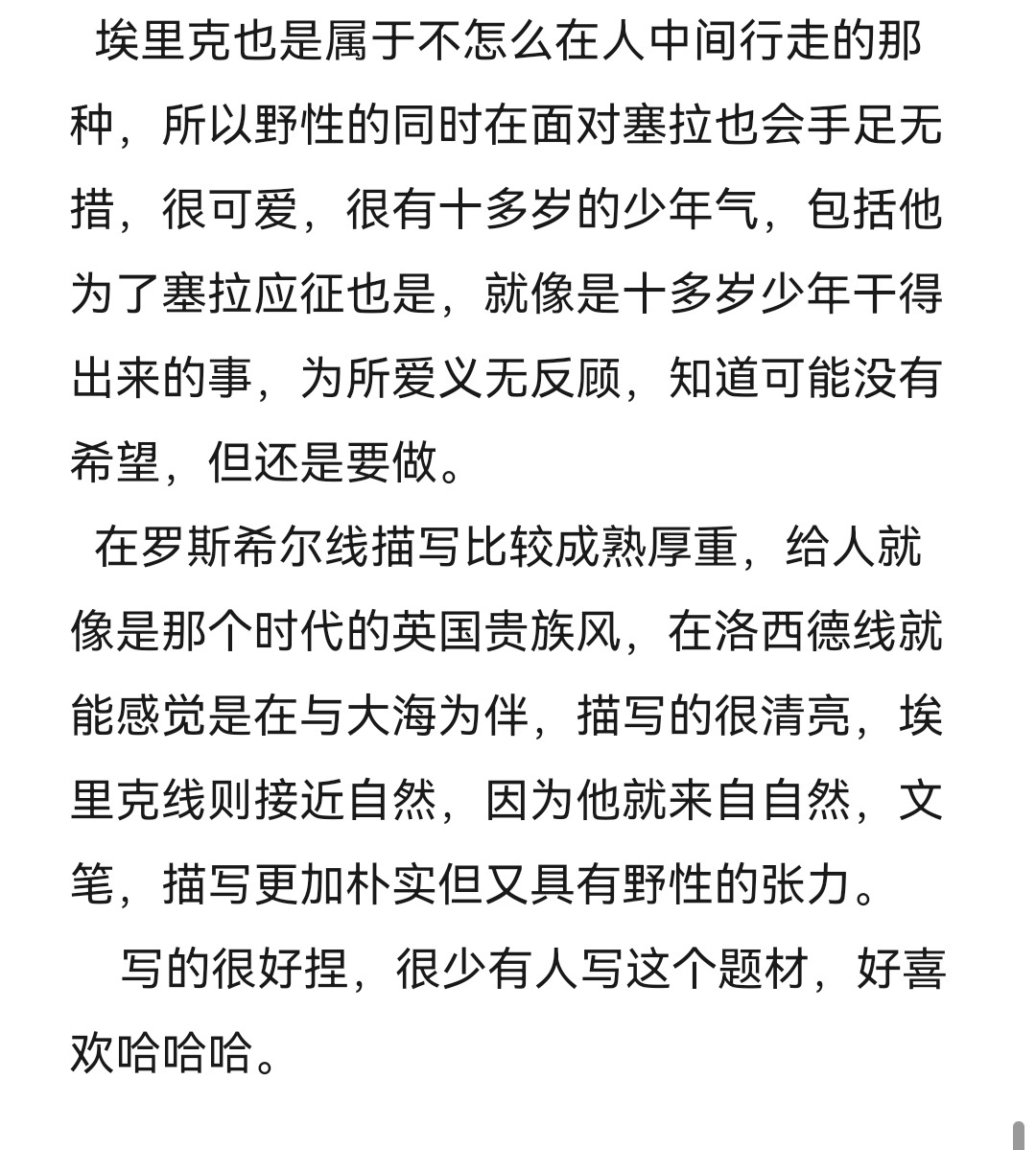 This world is a world full of malice towards Sera, and all kinds of dangers are under the water. Face to face, the mermaid and Sera's casual movements were like waves floating on them. Sera and the mermaid were not familiar with each other at first, but they behaved intimately. The mermaid was like an ignorant baby who didn't understand the world, but it was indeed a ferocious beast with a powerful ability to charm. Sera approaches with purpose, and there is a subtle atmosphere between the two of them, pulling each other away. It's a dangerous world indeed, for Serra. Every move in this world can sometimes affect the length of her life. The storm on the sea can swallow people up at any time. The ferocious non-human beings and the uneasy and kind-hearted "family members" are like waves in the night, coming one after another like Sera. Sera maintained a cautious attitude, controlled her voice, and dealt with vampires. She maintains the image of a simple and innocent girl, gets along with the young werewolf, and has a subtle atmosphere with the mermaid. Under extreme circumstances, humans can unleash extraordinary powers. In this harsh environment, Sierra could always maintain a calm attitude to save her life. The seemingly beautiful non-human creatures are deadly dangerous, and the seemingly innocent boy is full of calculations from beginning to end. A casual move can change the tide of rumors, and an inadvertent move can also stir up public opinion. It must be said that this is a dangerous world with surging undercurrents. If Serra had not been cautious and became a wave in the sea, she would have ended her life hastily.