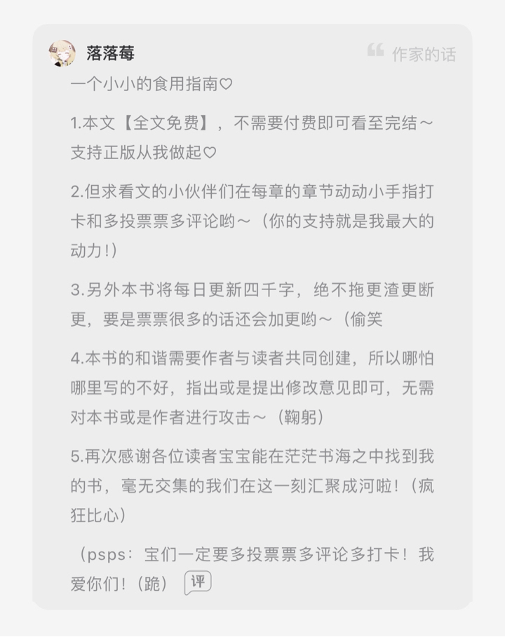 A small eating guide ♡ 1. This article [Full text is free], you can read it to the end without paying. Support genuine articles starting from me♡ 2. But friends who are reading the article, please use your little fingers to check in each chapter and vote more and comment more~ (Your support is my biggest motivation!) 3. In addition, this book will be updated with 4,000 words every day, and updates will never be delayed or interrupted. If there are a lot of votes, more updates will be added ~ (laughing) 4. The harmony of this book needs to be created jointly by the author and the readers, so even if the writing is not good, just point it out or suggest modifications. There is no need to attack the book or the author ~ (bow) 5. Thank you all readers again for finding my book in the vast sea of books. We, who have no intersection with each other, have gathered together like a river at this moment! (Crazy comparison) (psps: You guys must vote more, comment more and check in more! I love you! (Kneel down)