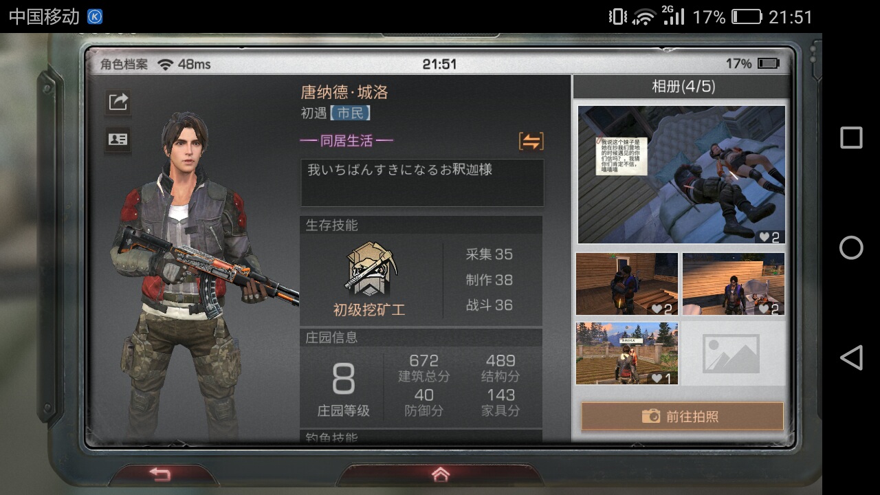 I am in the channel server, the camp name is Happy Valley, the server name is Hongqing Valley, the current level 8 manor, the three items are 46, 48, 48 respectively. I only play 4 or 5 hours a day, 6 or 7 hours at most. Without paying a penny, there are elevators and the like with other people and residences in the camp, or living in other people's homes... There are three or four AKs in the collection of commonly used weapons, 6 or 7 specially made howitzers in the collection, and several Mosin Nagas in the sniper collection. I also looked at the talents and skills, and they have been upgraded to thirty or forty levels, which refers to bravery and good combat. . . Collecting and other things have been upgraded to level 4. I am a senior gunsmith. I usually make guns and sell steel pipes. The title I use is Steam Leader. The accessories are now 888. I didn't buy any gift packs to recharge, so I am so low. The clothes I wear are angels in white, and my blood returns 2 per second.