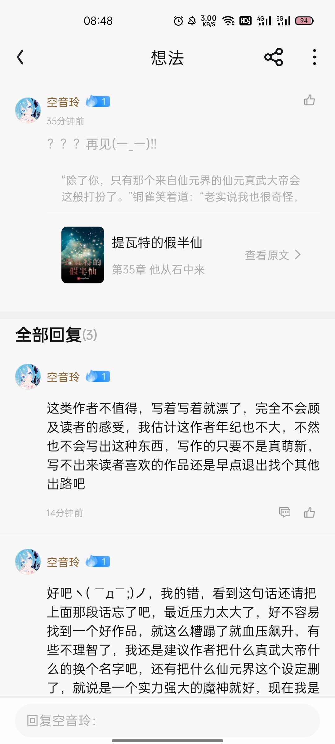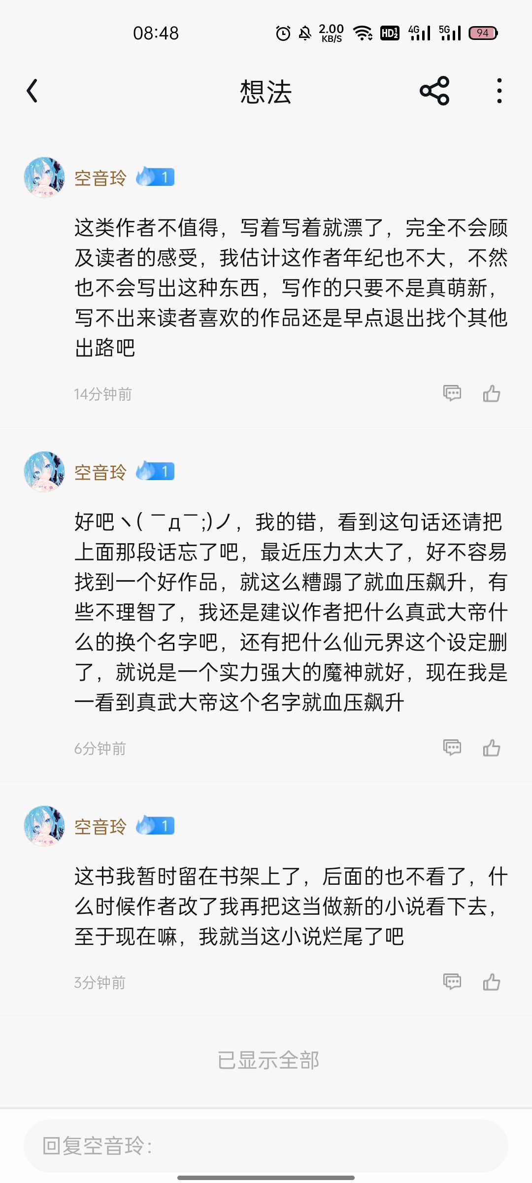 The suggestions are all in the pictures. Did the author see the stars on them? The 3 empty ones are your room for improvement, come on! Don't work behind closed doors, listen more to readers' opinions, and keep your own opinions, so that you can write good works. Don't insist on your own way, which will easily get scolded by readers. After you listen to my opinions carefully, I will change it back to 5 stars. By the way, the first paragraph of my reply in the picture is a bit harsh, so you can skip it without reading it.
