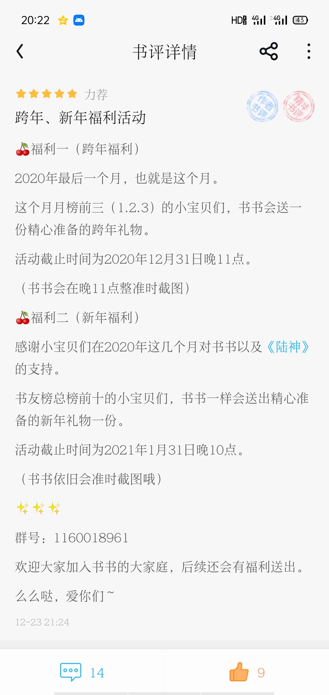 🍒Benefit 1 (New Year's Eve Benefit) The last month of 2020 is this month. Shushu will send a carefully prepared New Year's Eve gift to the little ones who are in the top three on the monthly list this month (1.2.3). The deadline for the event is 11pm on December 31, 2020. (Shu Shuhui will take screenshots on time at 11 p. M.) 🍒Benefit 2 (New Year's Benefit) Thank you little ones for supporting Shushu and "Lu Shen" in the past few months of 2020. Shushu will also send a carefully prepared New Year gift to the little ones who are in the top ten of the book friend list. The deadline for the event is 10pm on January 31, 2021. (Shu Shu will still take screenshots on time) ✨✨✨ Group number: 1160018961 Everyone is welcome to join Shushu's big family, and there will be benefits given out in the future. Yeah, I love you~