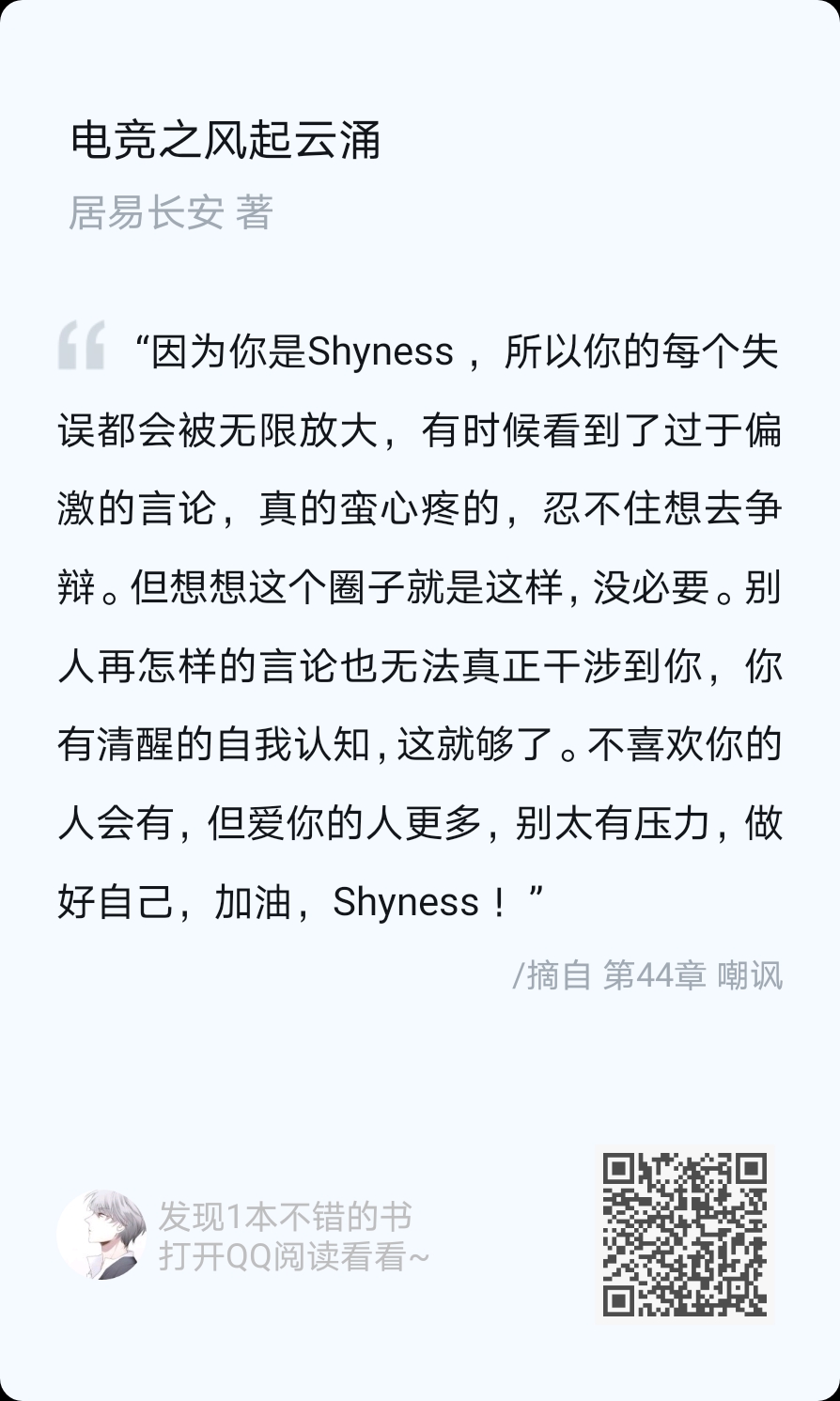 What is the spirit of e-sports? Love, passion and hard work! Come again! Do not give up! Bathing in the golden rain is the glory of the country! And what can easily destroy a person? Internet public opinion. I came across this book by chance. The games in it made even a layman like me feel excited, and the parents' understanding of their children was also touching. Later, Xiaochen was in poor condition, and various trolls came one after another, which eventually led to him announcing his retirement. This is the real status quo of this society, and it is also a sad point. There are no excuses in the competition. If you lose, you lose, but it does not mean that you will be pushed to the forefront and accept all kinds of malicious and endless criticism and abuse. The book mentions that we cannot change others, but we can change ourselves. Finally, I want to say to that person: May you always be warm and fearless.