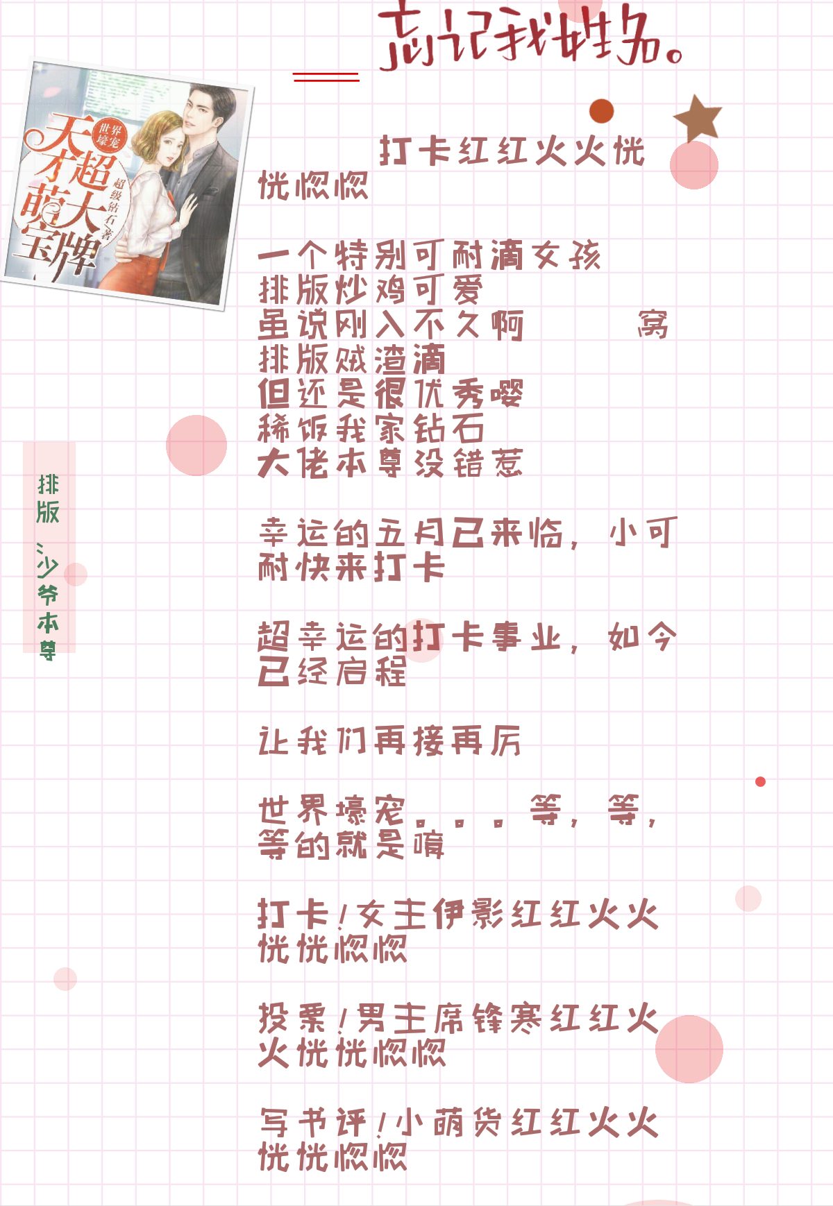 The new month of May has arrived, and a new check-in has begun. Check-in business continues let us keep up the good work Start checking in today! Check in! Come on, come on, come on Vote! Come on, come on, come on Book review! Come on, come on, come on