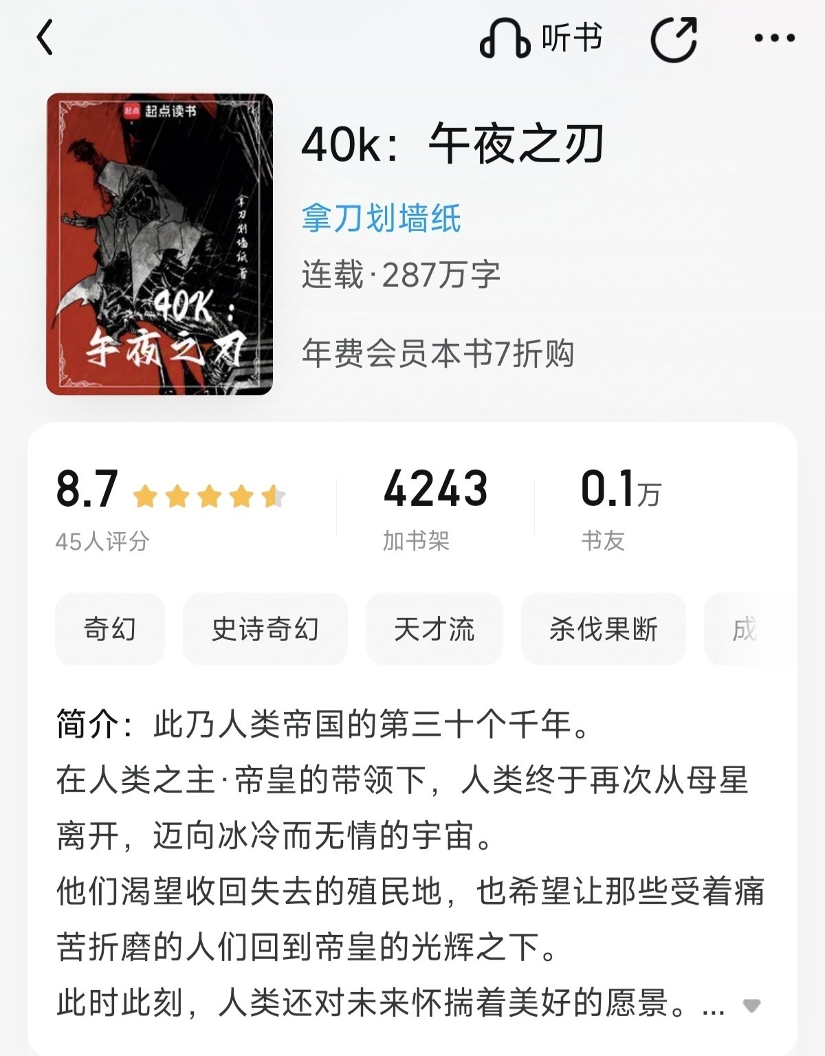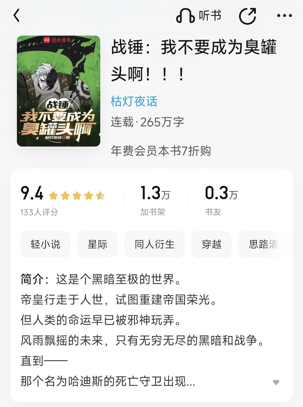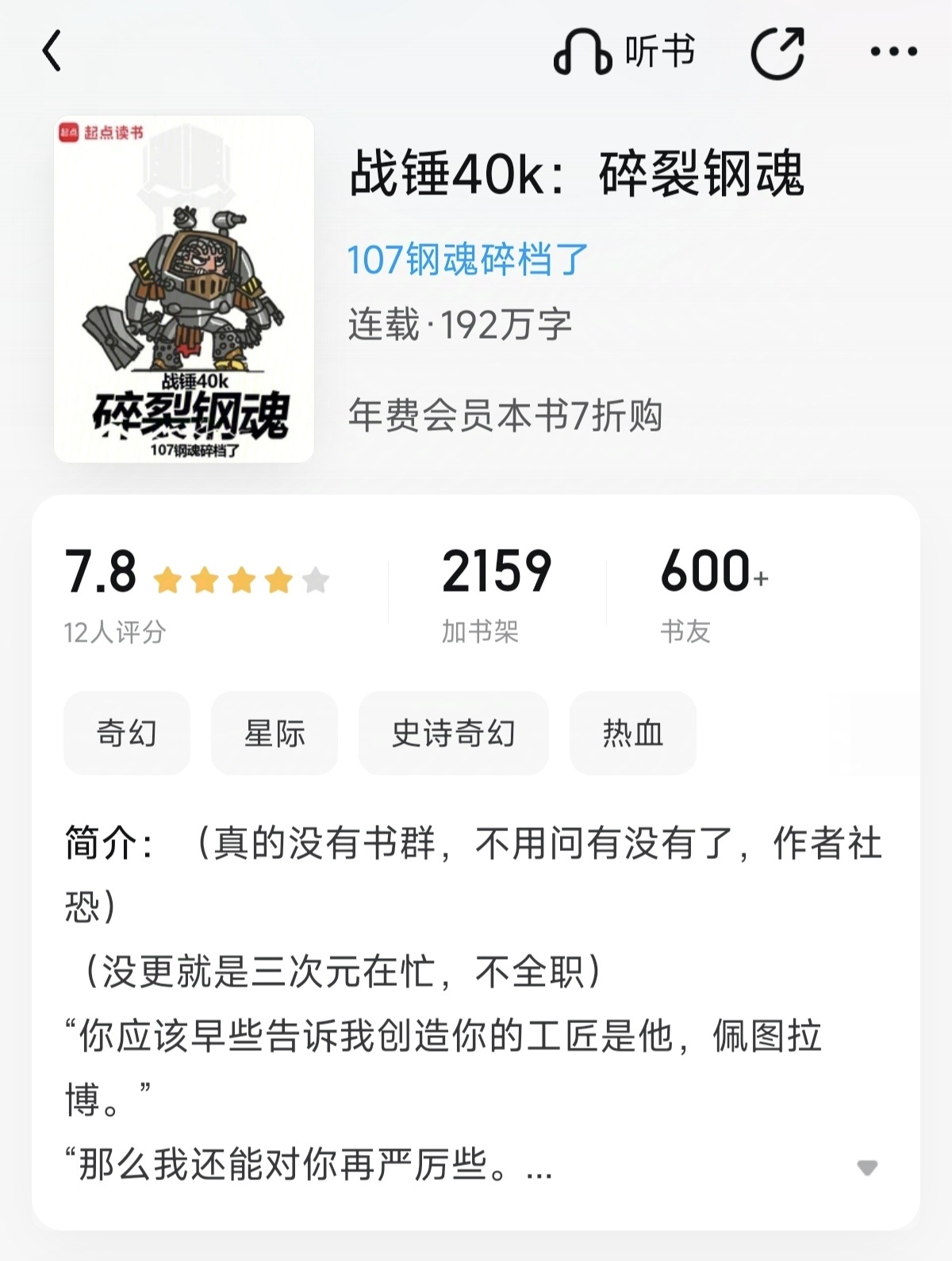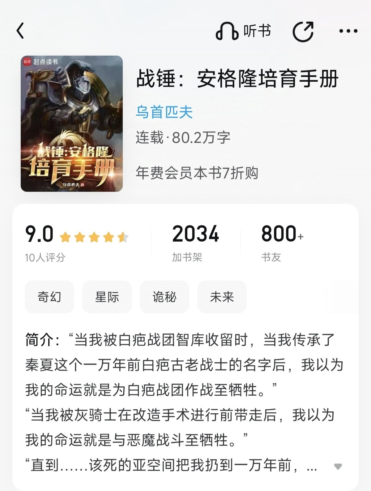 What can I say! The writing level of this book is very high. I even wonder if the author is a master from somewhere who opened a new account to write fan fiction. At present, this book, together with "I Don't Want to Be a Stinky Can", "Midnight Blade", "Angron Training Manual", and "Shattered Steel Soul", are the best Warhammer fan fiction I have ever read. And unlike the other four books on cultivating the original body, this book is a new approach and well written. Come on! In terms of the description of the interaction between the original body and the strength of the ascended demon Horus, I personally feel that this book is the best.