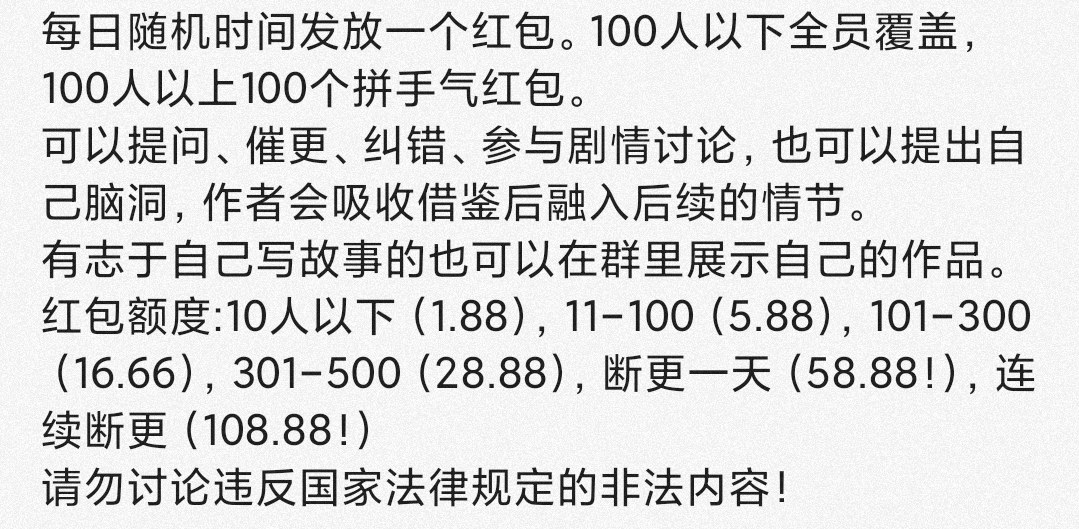 290787225 group number A red envelope will be distributed at random time every day. Coverage for everyone with less than 100 people, and 100 lucky red envelopes for more than 100 people. You can ask questions, urge updates, correct mistakes, participate in plot discussions, and you can also put forward your own ideas, and the author will learn from them and integrate them into the subsequent plot. Those who are interested in writing their own stories can also show their works in the group. Red envelope amount: less than 10 people (1.88), 11-100 (5.88), 101-300 (16.66), 301-500 (28.88), One-day break (58.88!), Continuous break (108.88!), Break the red envelope as a reminder to yourself. Please do not discuss content that violates national laws!