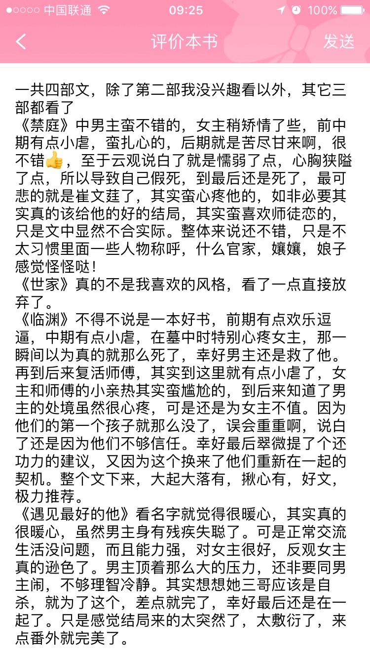 I still like Shijia and Linyuan the most. In the other two books, I didn't really like the heroine's character. But then again, the setting of the male protagonist in Linyuan makes me a little worried... So the aristocratic family is the most perfect, maybe because the female protagonists of the aristocratic family are also self-reliant, and you can always see a little bit of yourself in their stories. Hope Xingda said that online novels are just creating dreams, which is absolutely correct. So I insist that online novels should not be read by children below college. Their views are undecided, their minds are immature, and many things in romance novels cannot be taken seriously. Other book reviews say that Fourth Sister's writing is good but her outlook is not correct. It's hard to say that the fourth sister's writing is so good, and the story is so enjoyable to read. As for the three views, I also admit that I don't agree with some of the actions of the protagonist in the story, but I don't think this matter has anything to do with the author's three views. I wrote on the public account for two days, all about things around me. I once tried a short story in the novel. When I was writing the article, I was thinking about what kind of image I wanted to present, and what choices he should make for this image. Or I had conceived the story frame in advance, and when the details were slowly filled in, the character's personality was developed. And these have little to do with my three views, because in my opinion, the main framework of every novel has a prototype. What I want to do is to polish this prototype and turn it into a wonderful story. My three views have little impact on the story. Maybe this is no longer a book review... But I am saying this because I like Fourth Sister You, so feel free to dive into Fourth Sister's books, you won't regret it.