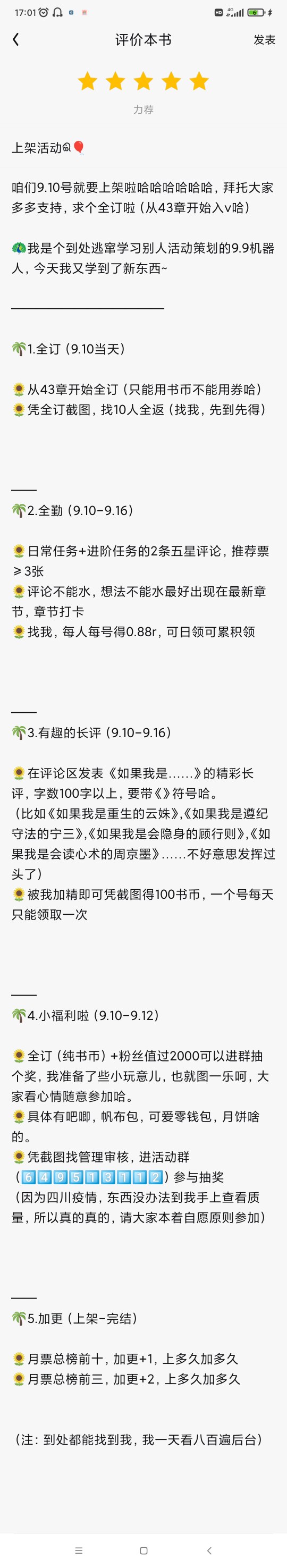 🌸1. Check in and step on the building Activity content: Leave your footprints in the check-in building at the top of the comment area (try to make different comments to prevent the floor from collapsing). When the floor reaches 1000, it will be closed and a new building will be opened. Reward: If you step on 9%, 29%, 49%, 69%, or 89% of the total number of floors, you will be rewarded with 200 book coins. If you step on 99% of the treasures, you will be rewarded with 666 book coins. Note: Valid before 8.31. 🌸2. Build a building in the comment area Activity content: Create a separate five-star review in the comment area, and reply more than 10 times in the building. Real feelings are required, and no comments are allowed. Reward: Bring screenshots to exchange for 100 book coins, 5 quotas per day, while stocks last, and the exchange time is valid from 8.1 To 8.11. (Try the water) 🌸3. Additional update (typing with trembling hands) Rules: Climb into the top six of the new book list, add +1, stay as long as you want. Climbed into the top three of the new book list, +2 updates the next day. Climb into the top ten of the monthly vote list, and you will get +2 updates, and you will get more updates for as long as you want. Description: ①The lists do not overlap. For example, if it is ranked third on the new book list, it will only add 2 updates every other day. If it is on the top of both the new book list and the monthly popular list, only the monthly popular list will be looked at. ②This activity is valid before it is put on the shelves. The rules will be changed after it is put on the shelves.