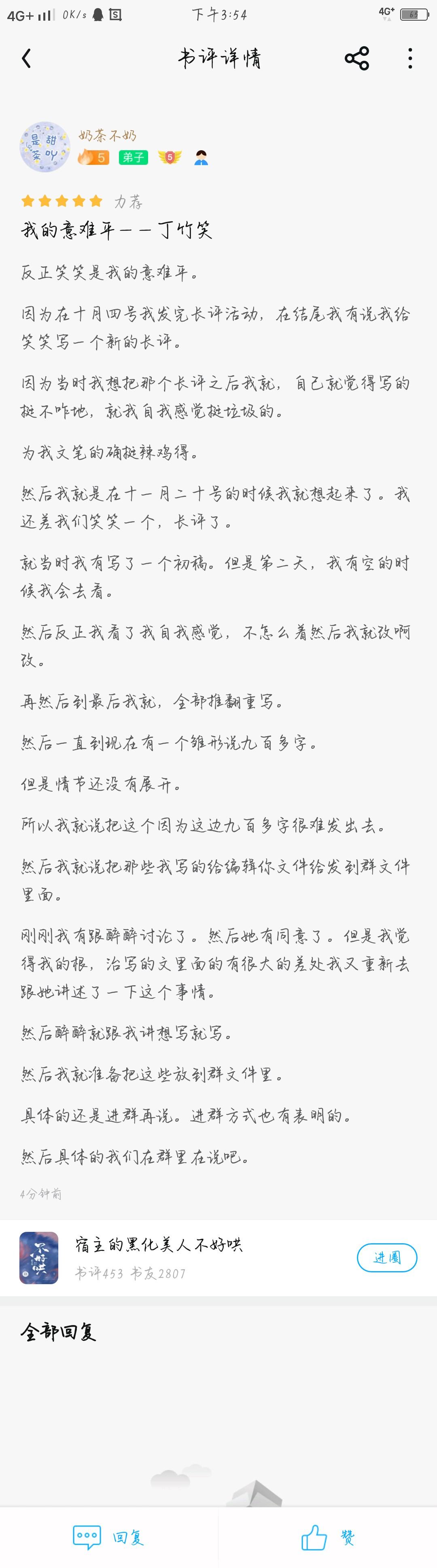 Let's talk about the plot first. The original plot is a common plot of marriage first, love later, but it's different after Nan Yuan has passed through it. The male protagonist's self-strategy, the female protagonist's unconventional tricks, and the big caveman really whetted my appetite. I have to say that the author has a lot of jokes and they are great. Also, as a girl who understands instantly, the first dimension is really in line with my preferences. I like it so much that I can drive anytime and anywhere ٩(๑^o^๑)۶ The male protagonist who is self-defeating never expected to meet a female protagonist who does not follow the routine, and the plot twist is also great. I thought the plot would be that simple, just everything Ye Shiyi did. It turns out that I was wrong. How could you set up such a simple plot →_→ This twist is really lovely. The villain roles that Ye Shiyi filmed and her withdrawn personality made everyone think that she was the murderer. However, she only likes suspenseful movies with gun battles. It is only because she had a bad childhood that she became withdrawn and likes to play murderous demons. She remembered what her grandma taught her: "Only if you are kind can you feel the kindness bestowed upon you by the world. But do good deeds without worrying about the future." In the end, she did it. It turns out that there are really people who can make the world unfair to me, but I responded with tenderness. This girl's correct views are completely in contrast to Su Wanwan. I really love Ye Shiyi. Let's talk about Su Wanwan and Le Yuanzhen in the extra story. Poor people must be hateful. Whether it is Su Wanwan or Le Yuanzhen, they are pitiful, but they are not innocent. Su Wanwan's love is a kind of morbid love that not everyone can bear. Le Yuanzhen told him that his behavior of shielding Su Wanwan was wrong. There is no place outside the law, and no one can be happy after breaking the law. I pity them, but I don't think they are innocent either. Finally, let's talk about the great fairy sentences and super positive values. Neither the entertainment industry nor the wealthy families are outside the law. --Chapter 53 "Only if you are kind can you feel the kindness the world bestows on you. But do good deeds and don't worry about the future." --Chapter 53 But no one expressed remorse or apologized to those who had been hurt by their words. They just went along without evidence and used the most vicious tone to "condemn" people who had nothing to do with them. None of them knew they were wrong. --Chapter 53 (As a side note, I have to say that this is very similar to the current ylq and our Internet Village residents) "I was in the shadows and did all the bad things. I thought I had nothing to fear after being so corrupted. But I found that I was still deeply afraid of someone remembering all the light and kindness I once had." --Chapter 55