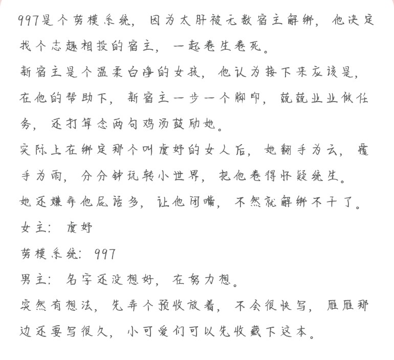 If you are interested, you can save it. I don't know if the title of the book will be changed in the future, so I would like to avoid using a system for whiteboarding first, and then ask the editor to help me when I start the book later. Jiang Yu: On the surface, she is gentle and quiet, but she looks very weak and easy to deceive, but in fact, she is really a boss. (There is a better name for the heroine, it may be changed, so I'll make do with it for now) 997: Model worker system, chatty, and often complained about exploiting hosts. Later, all new hosts knew his name, and no host was willing to bind him. Male protagonist: A man with thorns! Ginger thorns will fall off automatically when they come into contact with them. The setting is still not human, you can guess what species it is. (It has been set and will not be disclosed.) I haven't thought of a name yet. His existence is to like Jiang Yu, be good to Jiang Yu, and make Jiang Yu happy.