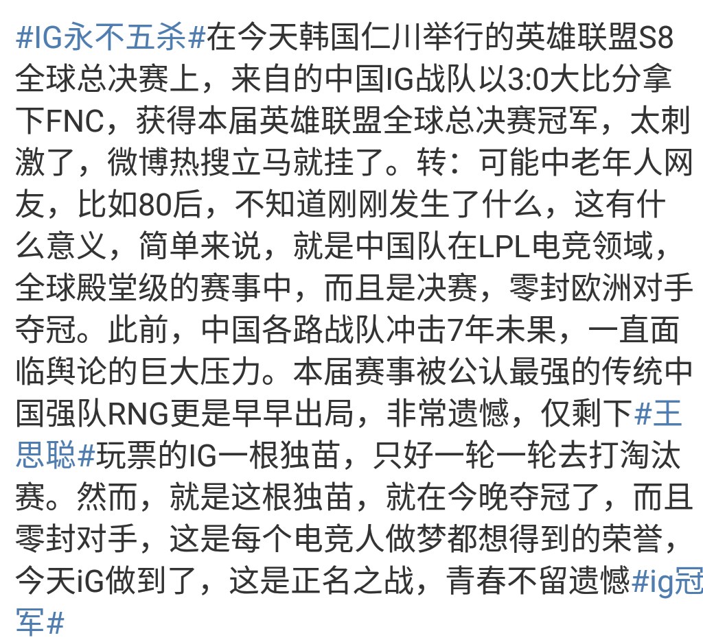 Thank you S8 for letting me know and follow IG. The "Rag Collector" team composed of a top laner that no one wanted, a borrowed jungler, a mid laner with bonuses, an adc acquired through live streaming, and a support team that followed up in a double row, completely proved themselves today. When they won 18 consecutive games in the spring split, you thought they were insignificant. Even when they lost the summer split championship, you laughed at them with a smile. When the royal family fell, everyone switched sides to support them, and they gained the world's attention. They said they didn't expect to win the championship, but they made history. A top laner who is a tough guy online and a sweet guy offline, a jungler who flies with rhythm and wins MVP, a mid laner who carries the whole game and remembers Chinese better than his native language, a team favorite ADC who is not good at operation and talks a lot, and a support who tries his best to protect his teammates to start the team perfectly. A team, a mountain, a story. Climb this mountain and you can hear their stories. Now, their story will be heard by everyone in the world. IG, reaching the top.