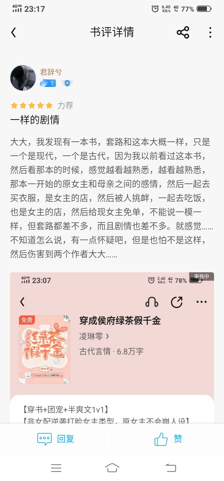 Because I suddenly like this type of writing, I also read another modern setting mentioned in the comment section. I have seen some updates in this one, and I have read more than a hundred chapters in that one, so I can almost make a comparison. In terms of character design, obvious differences can be seen in the characters of the protagonists of the two books. The difference between the male protagonist and several supporting characters is particularly obvious, and there is no trace of low-level reference. As for the plot, several points repeatedly highlighted in the comment area are common memes that are not the main focus of the plot, such as opening a shop and giving cards to slap the female co-star in the face. This routine is found in eight out of ten cool articles written by male and female channels. The content and logical chain of the main plots of the two articles are completely different. On one side, it is a house fight + suspenseful investigation, and on the other side, Mary Sue is constantly slapped in the face with a bit of urban fantasy. The content and style of the subsequent plots on both sides are completely incompatible. There is no need to hold on to the previous public opinion. The two articles are similar because they both chose the theme of real and fake daughters, where the real and fake daughters go hand in hand, and there are overlaps in settings. But if you carefully prove it, you will definitely not be able to make a color palette, and there will be no overlap in the logic chain of the plot that can be regarded as a blend. Even in Jinjiang, which is the most strict about this, it will not be judged as plagiarism and blending. On the contrary, if it is posted on the forum, it will probably be said to be a mother's disease. In addition, as far as my personal aesthetic is concerned, compared to another modern novel, this one is much better in terms of writing style, logic, plot transition, and character creation. The other book has too many nonsense parts that violate common sense in life. Even if I brainwash myself with a Mary Sue filter, I only lasted for more than a hundred chapters before giving up. However, these two articles are available on V for free. The readers chosen are different, and it is understandable that the style is more biased towards my own audience. What makes me wonder is how the readers of this article accurately found this article that not many people have read, and have been discussing the explanation in the comment area using similar words and "evidence". I don't want to promote conspiracy theories, but this matter is really against common sense. If there is really a leader or organizer, I hope you can focus more of your efforts on other serious places. Finally, I would like to give some encouragement to the author. As I said above, your book's writing style and logic are superior in all aspects, and after reading both of them, I don't think it constitutes plagiarism or fusion. Although at present, the huge difference in popularity appears to be one-sided in the comment area, the determination of plagiarism and spoofing is not justified by whoever has the louder voice, nor does the book with the louder voice be better. Come on, write a book well, and don't let external voices affect your creation. Your work is your foundation, and you will be able to survive. After reading the update in the middle of the night, I looked at the comment area and typed a string of words. I hope the author can persevere and not waste his creative talent. Come on.