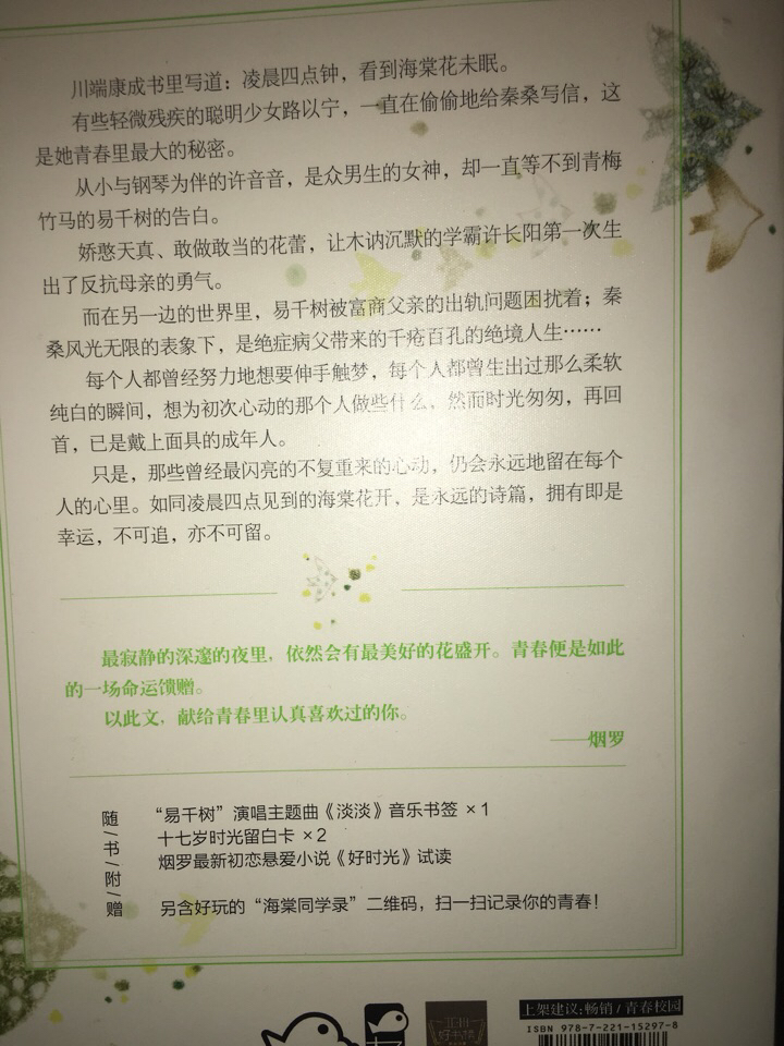 This article is for you who had a serious love in your youth. Many years later, we are both happy, but occasionally we have some regrets. You are not the one who gives me happiness. Lu Yining, a smart girl with a slight disability, has been secretly writing letters to Qin Sang. This is the biggest secret in her youth. Xu Yinyin, who has been playing the piano since childhood, is the goddess of boys, but she has never been able to wait for the confession of her childhood sweetheart Yi Qianshu. The naive and daring flower bud gave the dull and silent academic tyrant Xu Changyang the courage to resist his mother for the first time. On the other side of the world, Yi Qianshu is troubled by the affair of his wealthy businessman father; beneath Qin Sang's glorious appearance is a life full of holes caused by his terminally ill father... Those once brightest heartbeats that will never come back will remain in everyone's heart forever. Just like the begonia flowers blooming at four o'clock in the morning, it is an eternal poem. To have it is to be lucky. It cannot be chased or kept.