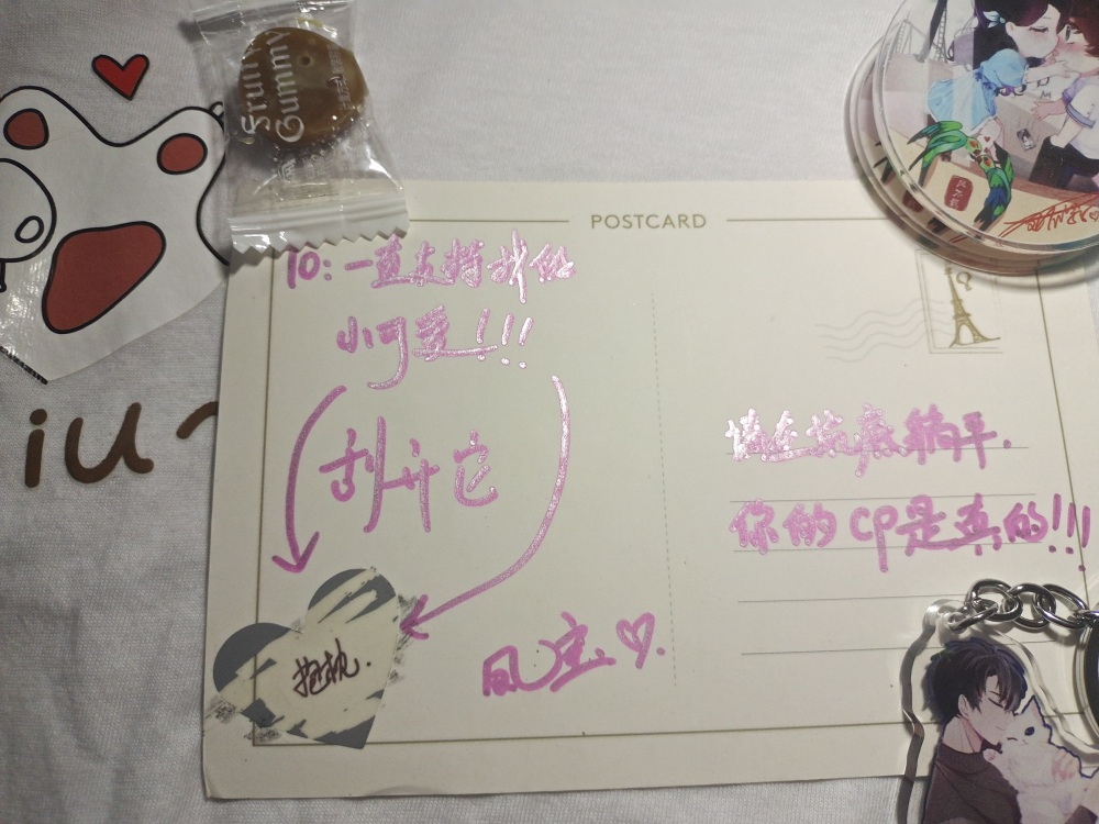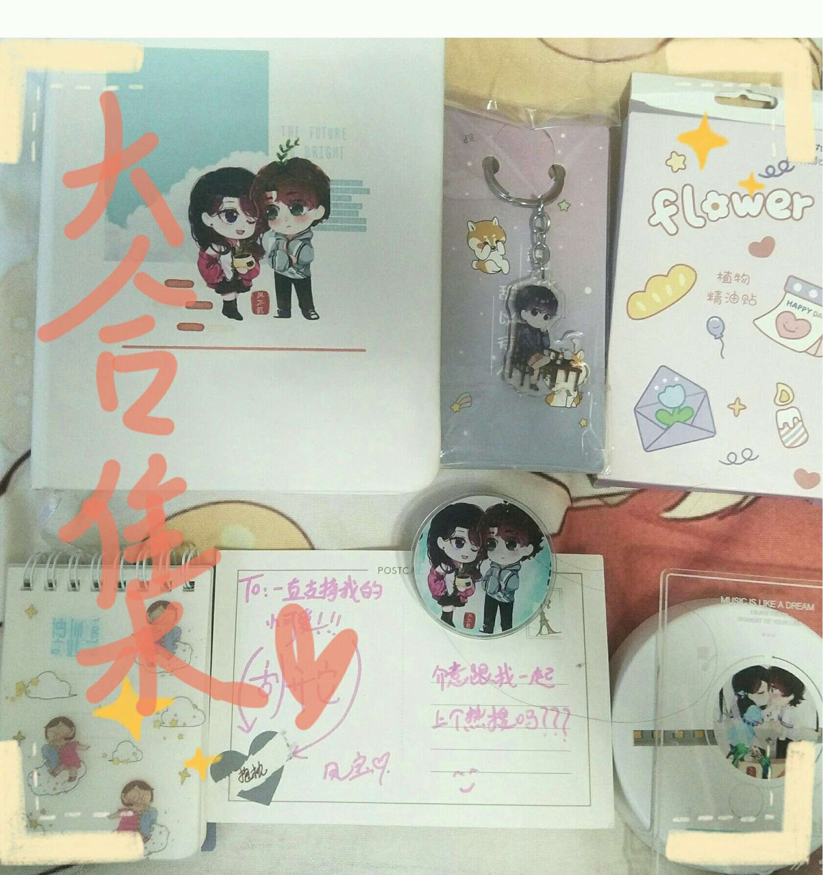 I'm also here to post pictures of the blind box ^_^ I really regret that I only got one, ugh~ And what excites me the most is that Douding is involved in this gift💗 Dali card, pp clip, small mirror, notebook, notebook, essential oil stickers, key chain, candy, handwritten postcard Finally I love you~