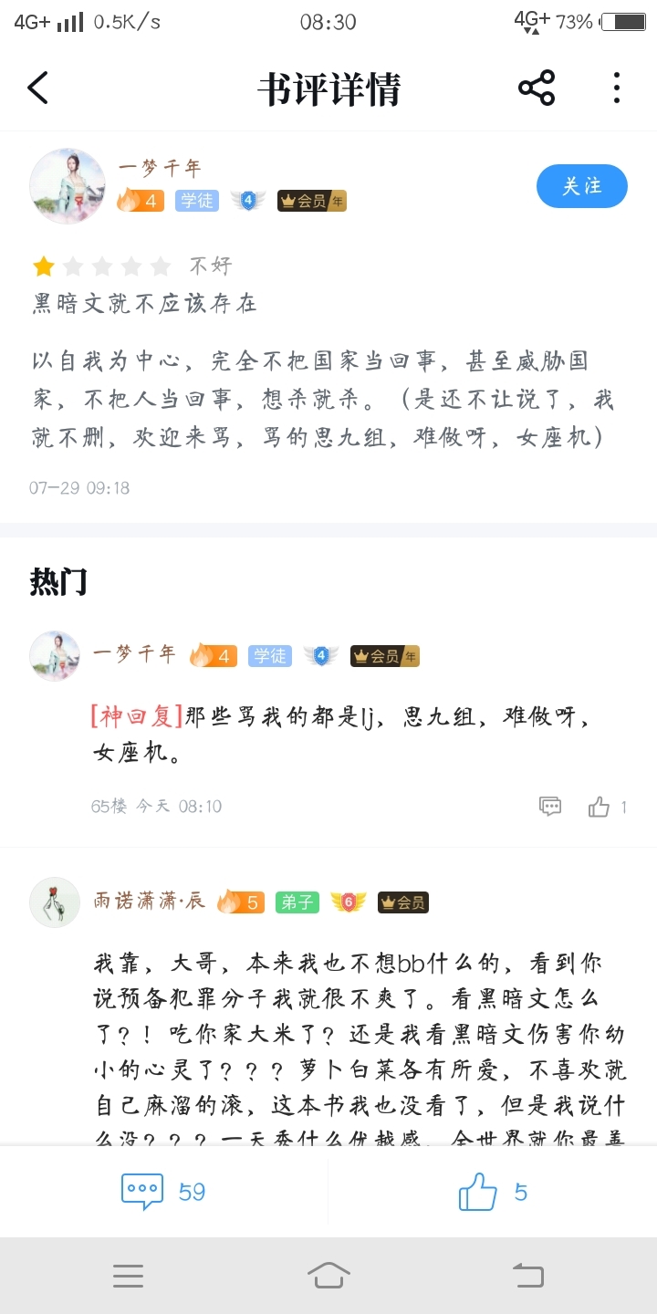 To be honest, this book is a good book, but there is a post that criticizes this book for not existing, and also says that people who read this book are preparatory criminals. Can you bear it? Please report it to all book friends. Thank you (he is talking about all dark literature)