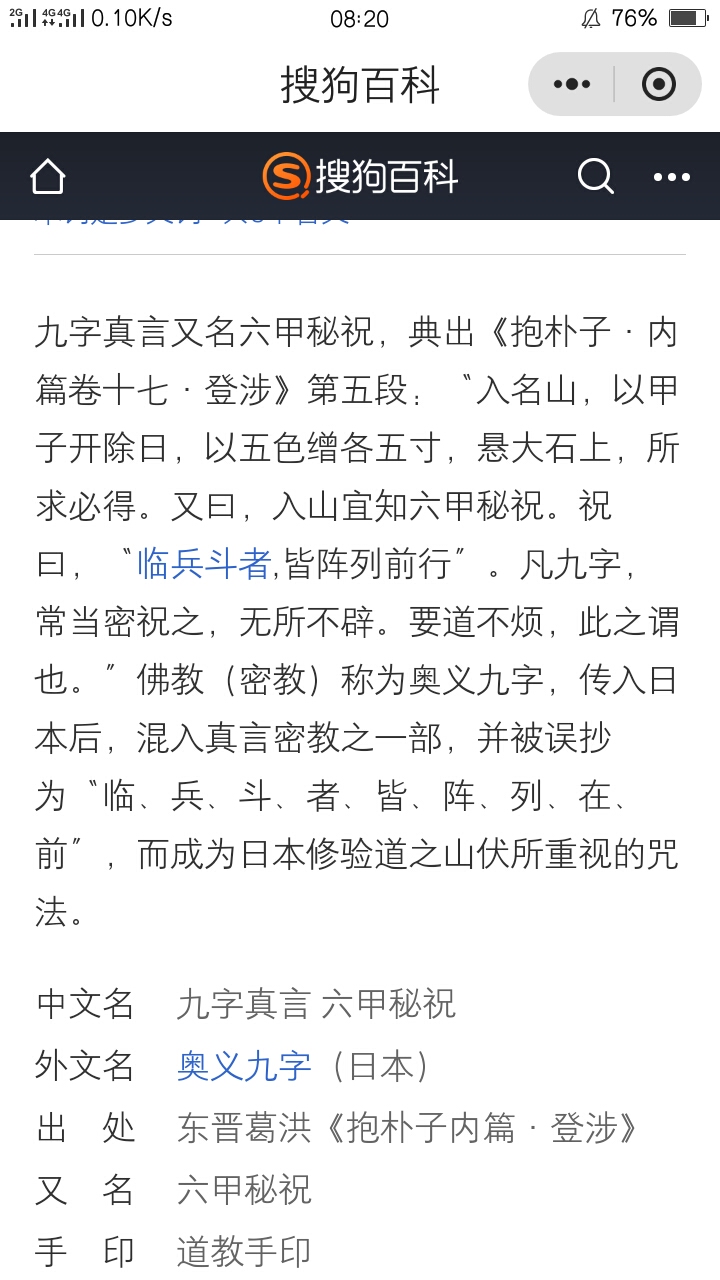 The nine-character Taoist mantra is: Lin, Bing, Du, Zhe, Jie, Formation, Formation, 1. Pro Symbolizes: physical and mental stability; means: remaining calm in the face of adversity, maintaining an unfailing will, showing a strong body. Combined with the spiritual power of heaven and earth, it has great power to subdue demons and eliminate demons. 2. Soldier Symbol: Energy; represents the vitality of longevity and rejuvenation. Move as fast as a dart, observe the way of heaven, and execute heaven's actions. 3. Fight Symbol: Shouzhou resonance. Brave and courageous, showing fighting spirit when encountering difficulties. 4. Symbol: Recovery. Show the power to freely control your own body and the bodies of others. The spiritual power of all things is at my disposal, and the harmony is boundless. 5. All Symbol: crisis sensing. Demonstrate the ability to understand and manipulate people's hearts. All troubles are solved, and the four images are harmonious. 6. Array Symbol: Telepathy, invisibility. It represents the ability to combine wealth and respect. See through, gain insight into the enemy's psychology, and stay calm. 7. Column Symbol: Time and space control. Shows the heart of helping others. Split all obstacles that hinder you and become subtle and tactful. 8. In Symbol: Control of the five elements. It means that you can use your superpowers more freely. Let all things be equal, and heaven and earth be one with me. 9. Before Symbol: light, Taoist heart. It represents the mysterious realm, which is the realm beyond the five elements. My heart is the elixir, the unity of all transformations, the fundamental and ultimate state.