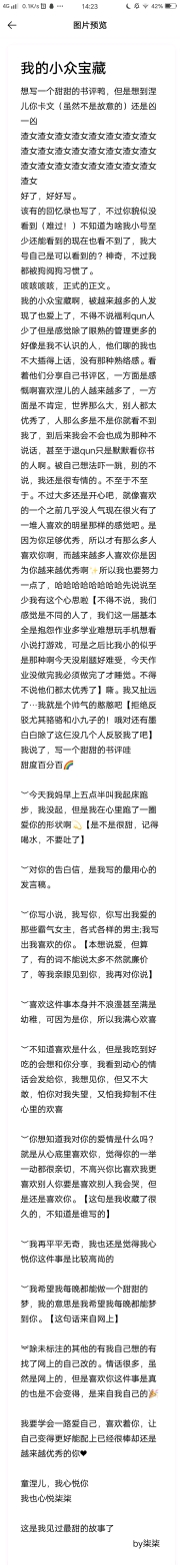 I want to write a sweet book review, but when I think of you, Nie'er, I feel awkward (although I don't mean to) and I want to say you! Ahem, cough, cough, formal text. My niche treasure, more and more people have discovered and fallen in love with it. I have to say that there are fewer people in Welfare Qun, but I feel that apart from the familiar management, there are more people I don't know. Watching them share their book reviews, on the one hand, I feel emotional that more and more people like Nier. On the other hand, I am not sure. The world is so big, everyone else is too good, and there are so many people. Will you not be able to see me? Will I become the kind of person who doesn't talk, or even retreats and just silently reads your books? I was shocked by my own thoughts. If nothing else, I was still very dedicated. Not to not to not to. But most of the time I'm still happy, just like I feel like a star I like who was barely popular before and is now very popular and has a lot of people liking me. It's because you are good enough that so many people like you, and more and more people like you because you are getting better and better✨So I have to work harder, hahahahahahaha. At least I have this idea. [I have to say that we feel like different people. This year we basically complained that there were too many homework and it was difficult to study and wanted to play on mobile phones and read novels and play games. But after that, those younger than me seemed to be like that. I didn't finish my homework today. It felt so bad. I had to finish my homework before going to bed. I have to say that they are all too good] Hiss. I'm digressing again... I'm just a handsome fool [especially Luo Luo and Xiao Jiuzi who refuse to refute! Oh, yes, and Mo Baibai. Apart from these three, few people have refuted me, right?] I said, write a sweet book review 100% sweetness🌈 My mother asked me to get up at 5:30 in the morning for a run today. I didn't get up, but I ran a circle in my heart to love your shape💫Isn't it very sweet? Remember to drink water and don't vomit This confession letter to you is the most thoughtful speech I have ever written. You write novels, and I write about you. You write the domineering female protagonists and various male protagonists that I love; I write about you that I like. [I wanted to say love, but forget it, some words cannot be said too much or they will be cheap. I will tell you again when I see you in person] Like this thing itself is not romantic or even childish, but because it is you, I am full of joy I don't know what liking is, but when I eat delicious food, I want to share it with you. When I see touching words of love, I send them to you. I want to see you, but I don't dare. I'm afraid that you will be disappointed in me, and I'm afraid that I won't be able to suppress the joy in my heart. Do you want to know what my love for you is? I just like you from the bottom of my heart and feel that every move you make is very kind. I am not happy that you like others more than me. If you like someone else, I will cry, but I still like you. [I have collected this sentence for a long time, I don't know who wrote it] No matter how mediocre I am, I still think it is noble to please you. I wish I could have a sweet dream every night, I mean I wish I could dream about you every night. [This sentence comes from the Internet] Except for the unmarked ones, there are others that I thought of or found online and modified by myself. There are a lot of love words, although they are online, but the fact that I like you is true and will never change. It comes from myself🎉 I have to learn to love myself and like you along the way, and make myself better so that I can match you who is already great but is getting better and better❤ Tong Nier, I love you I am also happy with Qiqi This is the sweetest story I have ever seen As long as it's you, I'll be filled with joy❤ byQiqi [I'm afraid I can't write the words and put a picture]