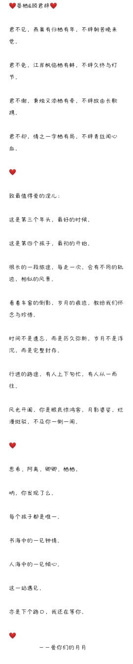 ❤Yan Qi&Gu Junci❤ Don't you see, the swallow nest has returned to its nest for many years, and it stays up late at night without hesitation. You can't help it, the maples on the river bank are fresh, and they will not say goodbye to the Lantern Festival. You don't thank me, I hold the candle and you are attached to me, I will carry you with you without saying goodbye. If you don't stop, the word "love" has its own situation, and Qingsi will not hesitate to listen to the painstaking efforts. ❤ To Nier, the most worthy of love: This is the third year, the best time. This is the fourth child, the first beginning. It's a long journey. Every time you take it, you will have a different trajectory and similar scenery. Looking at the reflection in the car window and the traces of time teach us to miss and cherish. Time is not forgetting, but lasting. Time is not ups and downs, but completely sealed. Along the way, some people were rushing up and down, while others were passing by. When the scenery opens and closes, you are a visitor in front of your eyes. The moonlight is whirling and mottled, not as good as a pavilion on your side. ❤ Enxi, Ali, Qingqing, Qiqi, Now, did you find it? Every child is unique. Love at first sight in the sea of books. Love at first sight in a sea of people. Meet at this stop. It's also the next intersection, I'm still waiting for you. ❤ --Love you Yueyue
