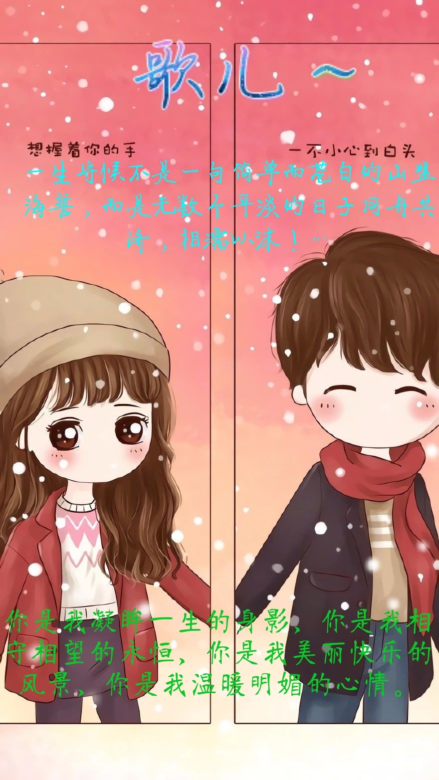 Ge'er~ The time is beautiful, With you by my side, Gazing at the fleeting scenery; No regrets in the years, True love and persistence, Smell the scent of autumn; Holding hands on the worldly road, The companionship of the spiritual watch, Holding hands in the world of mortals in this life, Morning and evening, Picking up ink with your fingertips, Blooming a gentle and elegant flower, just for you, The fragrance that fills the soul, I just want to think about you quietly like this, As long as you are here every day, The fragrance of my heart that wraps around my fingers flows gracefully in the moonlight, Intoxicated by the passing years of a heartfelt note, Just wait silently like this, Crossing each other's souls, Accompanying the journey of the soul, I have you all the way, Never give up... I use light ink, Soft as the end of the world, Let the intoxicating fragrance of ink, Flow into the smile on the other side, Elegant feelings, The dust that cannot be shaken off, With delicate and warm heartfelt words, Completed with tenderness that wraps around your fingers, Carrying the thoughts in my heart, Picking up the deep feelings of time, Hold a ray of flower fragrance, With the beauty of a flower blooming, In the midst of the passing years, Soaked in the fragrance of ink, Decorate the past and dust it away, Listen to the Sanskrit sounds of the years, Cross the bay of the soul with your heart's words, Use true feelings to interpret long-lasting thoughts, Smell the fragrance of ink and leave behind little bits of true feelings, May Geer be warm and happy every day! Looking back several times, The flowers and moon are lingering, The most beautiful, But meet. A few harps, Carrying the child's hand, The happiest, But the head is white. A few orioles chirped, Relying on the willows, The most difficult, But parting. A few red beans, Heartbroken, The most bitter, But miss it. A few pink slips of paper, Letters from home thousands of miles away, Miss you most, But concerned. How many times have the flowers bloomed? Waiting impatiently, The saddest, But he didn't return. A few cups of jade wine, Drunk and lying in Xiaoxiang, the coldest, But betrayal. A few love words, Make a promise lightly, The most painful, But it hurts. A few tears, You are ruthless, hurts the most, But a stranger.