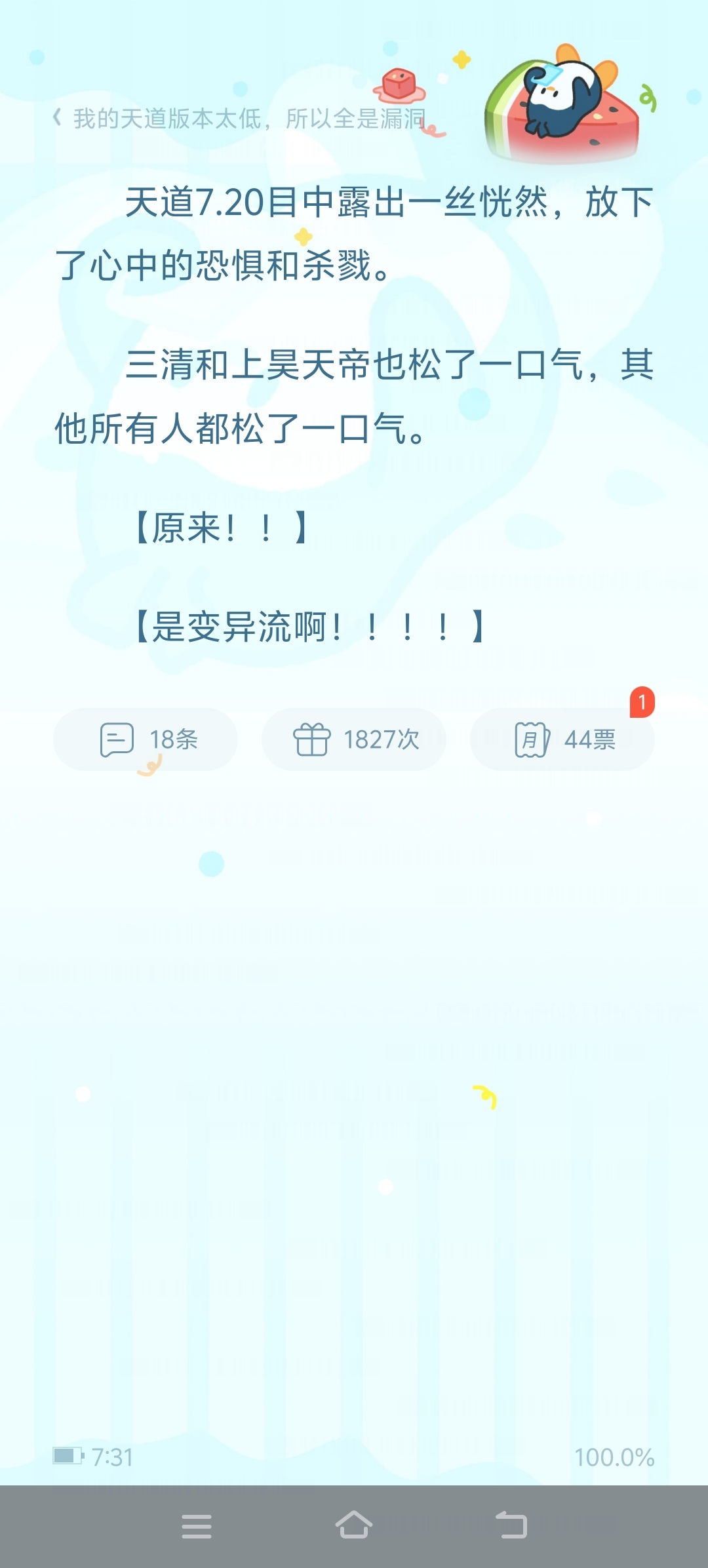 "The current environment is really getting worse and worse. The rich are soaring in the sky, but the poor are struggling. I think the cultivation world is taking jujube pills." "I really miss the time when the old version was full of loopholes in cultivation. This version 7.18 Of the Way of Heaven is really disgusting..." "What, the Way of Heaven has been updated to version 7.18?" Levi looked at his Version 1.0 Of the Way of Heaven and fell into deep thought! So what am I practicing these days? ......... The good news is that the old version of Tiandao is still compatible and full of bugs. The bad news is that if Heaven catches the cheater, he will be rewarded with a thunder calamity on the spot, banned, reincarnated, and rebuilt. In order not to be thrown into the underworld to work. Levi decided to hang up! As the saying goes, a pig can fly on the wind, but there are seven wind vents ahead! "As long as I fly fast enough, the calamity won't be able to catch up with me!" A few years later. Heaven. "Fellow Immortal Lords, do you have anything to say about the crime of reporting monk Li Wei's huge amount of unknown cultivation to Master Lei Bu?" "No one can be above the Heavenly Dao!" The Immortal Lords said with a look of indignation: "So Master Leibu, stop it!" "It's all Li Wei out there!" How can you judge the accumulation of loopholes in the seven Heavenly Dao versions of the gods run by three generations of Leibu's ancestors!