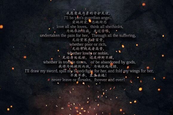 I want to be her guardian angel, Love where you love, think where you think Because she did not bear the pain and went through the suffering,. Whether poor or rich, Whether humble or noble, Regardless of whether we are in troubled times or God does not care, I will fight for her with my sword drawn. Fold her wings for her, Never leave, forever.