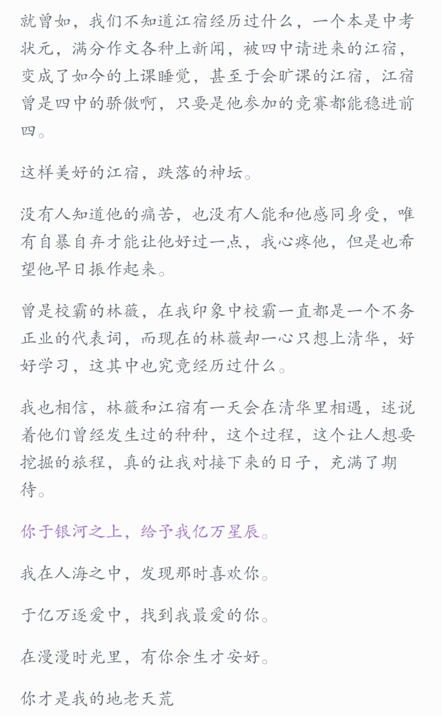 Jiang Su and Lin Wei, one is a rebellious school bully and the other is a beautiful girl who must take the Tsinghua University entrance examination. The characters have distinct personalities. Compared with "I Really Want to Live Next Door to You", this novel mainly highlights the long-lasting feelings. It is not as vigorous as the former, but it is equally inspirational and touching. Lin Wei was one of the children of a reorganized family. Her father passed away and her mother took her to remarry. A few years later, her mother passed away and her stepfather found a stepmother. Because of her special status, she had no relatives in this family and was ostracized. She couldn't bear it anymore and began to resist. Fortunately, she had a stepmother who was a teacher who always took care of her and comforted her. Her only way forward was to get into Tsinghua University. Jiang Su lives alone, they are in the same class, and they are neighbors face to face. He is a school bully and a scumbag who is despised but feared by everyone. He is notorious. After getting along for a long time, she gradually sees the real him. Encouraged by love, the school scumbag counterattacks and turns around. The plot is slow, but the details are very detailed. Jiang Su likes Lin Wei very much. He is handsome and handsome and always becomes her protective shield. Lin Wei was not just a little white rabbit who only let others bully her. She accidentally knocked Jiang Su down for the first time, which completely refreshed his understanding of this gentle academic master. He is the shining star in the eyes of all the girls on campus. He just wants to get into her heart. He will also be jealous and angry because of her indifference and needs to be coaxed. The two often studied together. Lin Wei didn't want to be in an environment like her own home, so she often did her homework at McDonald's. Over time, Jiang Su noticed her and cared about her. Gradually, Jiang Su's house across the street became her safe refuge. Jiang Su's family has a strong background, but he is not the eldest son to show off. He will often line up to buy her favorite milk tea just for her favor. When she is bullied, he will be the first person to comfort her, take care of her, and encourage her. Because of her, she would let her teammates go countless times. He had never shown the pain from his family in front of Lin Wei, and he felt that after gradually getting to know Lin Wei, compared with it, the past events in which he had disagreements with his father and even committed suicide because of certain things were not worth mentioning. In countless details, the two gradually became affectionate and their relationship heated up. They faced all the hardships from their respective families together and pushed each other to make progress academically. The whole story is filled with youthful sentiments, careful and shy. I have the final say if I like you, nothing else counts, including you. No matter what kind of person you are in the eyes of others, no matter what you have experienced, I just want you to know that I like you and I have the final say.