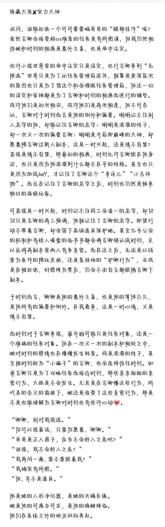 Qingqing is a god-level fast traveler. In order to escape from the fast travel trap, Qingqing embarks on the last mission to enter the most dangerous infinite world. Tang Lian said welcome home to her. Brother Shi was very special to her from the beginning. Later I discovered that Brother Shi was the first generation god of the infinite world. His soul was broken into countless pieces, carrying a copy of the world. But what we get along with Qingqing is just his body, his heart is in the illusion, and his soul is in countless copies. Let me just say, why is his favorability so little? Tang Lian is the embodiment of the will of the world. He found Qingqing and hoped that Yan Qing could replace Shi Yan and become a new generation of gods. The old gods will be wiped out and there will be no way to save them... Qingqing, Shi Yan, and many other NPCs who were originally the experimental subjects of the first-generation gods, but were eliminated and turned into dungeon bosses... Shi Yan succeeded, he became the first generation god and retained all his memories... And after failing to become an NPC, he also regained his memory in front of Qingqing. Qingqing, who was also a failure, had her memory erased and was sent away. Combined with the consciousness of the world, they hope that Qingqing will become a new generation of gods. Is it possible that Qingqing was chosen from the beginning? Brother Shi helped her conduct the experiment... Yan didn't care about the original sentence at this time. When he raised his eyes, he patted the girl's head and said, "If a person who is still alive is put into the nutrient solution..." "I don't know what other people are doing. If it were me, I might find it very boring." Shi Yan repeated: "Not interesting?" "Soaked in the nutrient solution, just like these organs, they cannot move, cannot walk, and cannot go anywhere." Yan Qing paused for a moment. "If it were me, I'd rather die. But ask yourself, if you were to put yourself in Yan Qing's shoes to answer this question, she would not be as relaxed as she said. "Me? "(Qingqing asked Brother Shi, Brother Shi's answer) "If it were me, I would just wait for death. " Yan Qing captured something keenly: "What if... It's not you? " Shi Yan paused for a moment. He seemed silent for a long time, and seemed to already have the answer in mind. "I'll keep everyone else out of the cold night. "Others stayed away from Han Ye, but what about himself? Did they leave together, or... Stayed alone? Yan Qing couldn't remember anything, but at this moment, there seemed to be a rumble deep in his memory, and something collapsed. She heard a young boy's voice. He was telling her, don't be afraid, run forward and get out of here. He seemed to hug her and then touched her head with a low voice. 'Go forward and don't look back. ' ... -------- "Most of the NPCs who entered this dungeon were candidates for the original gods. There was only one winner in the end, No. 0824. All other candidates had their memories erased and became NPCs in each dungeon. Qi Sheng paused, "Except No. 0825." " At that time, No. 0825 Was like a piece of ice that had not melted for many years. He could not speak or smile. When he looked at people, he was like looking at a lifeless object. Unlike other candidates, No. 0825 Was brought here by Tang Lian midway. She is a beautiful and indifferent little girl. She has an indifferent aura around her when she is silent, which will only make people want to stay away from her. Under the first-generation gods were countless children who had died in the primaries. At 0825, they were almost parachuted into the final stage of the race, and were naturally excluded by everyone. In the end, the cold and cold little girl had a cold face and unceremoniously pinched the wrist of the child who came to make trouble. She lowered her head and said without any empathy: "Does it hurt? " The child recoiled with pain on his face. The girl laughed and said, "Then stay away from me. " "... I don't know where Yan Qing went these days. When he came back, he was not a dungeon NPC, but a player. "Chu Yue said: "But she has no memory of when she was a candidate, and she doesn't know who we are. " ------ I originally wanted to write about sugar, but I couldn't control it ᵟຶᴖ ᵟຶ