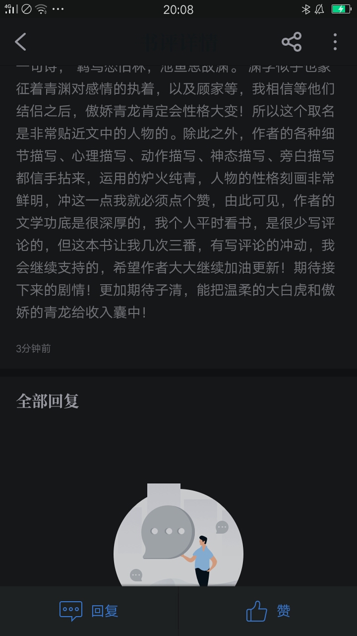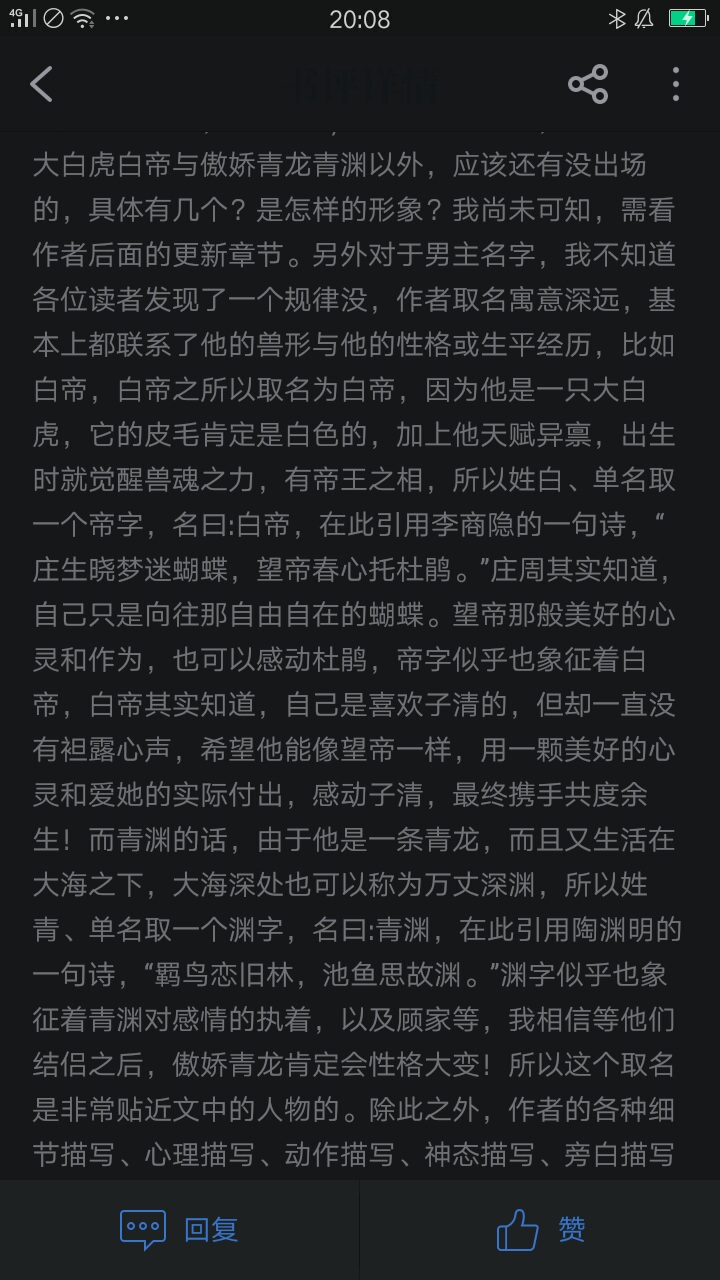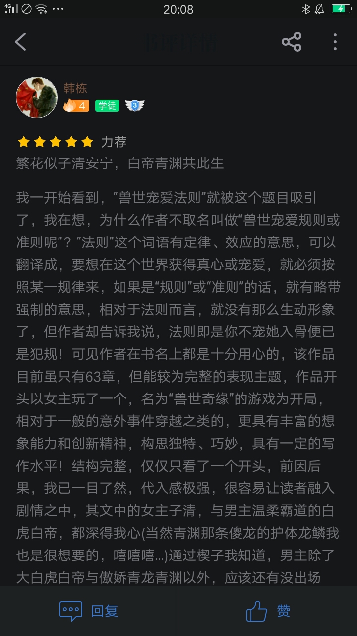 First of all, I wish Yuyu a big hit, hehe Well, I met Yuyu not long ago, but I didn't expect it to be on the shelves so soon. Yu Yu is an author with a good attitude. Every time he sees suggestions from readers, he expresses his support and will work harder to improve. However, Yuyu, you're not going to set up a book club even though it's almost on the shelves? 😂 (I quietly said that if I build it, I will reward an administrator, hehe) - About this article Well, because the Beast God didn't care about the Beast World and caused chaos in the Beast World, but could do nothing about it, Ziqing was selected without knowing it through the game (a miserable batch, although there is still a system, and he can play the Beast World for life without being affected by the virus [I am envious of myself who has been driven crazy by the virus]). This setting is unusual and can be said to be very eye-catching. However, this game allows Zi Qing to go to the beast world and adjust his face, which made me very interested in Zi Qing's own appearance. The plot is just a bit fast, so does Yu Yu plan to finish it around 300 chapters? Another big problem with Yu Yu is that the relationship line is too fast, and the relationship between Zi Qing and Qing Yuan has not been resolved yet. Maybe Zi Qing will find it difficult to accept the second one after accepting Bai Di, and Qing Yuan is also miserable enough. 😂 And what Ziqing said when he met Bai Di: "How can I be so bad!" This made me feel a little embarrassed. But the orcs in Baidi's tribe in the Beast World are very friendly and make people feel warm, like family around them. I think this is one of the important reasons why Ziqing can quickly be accommodated in the Beast World. However, Yuyu also worked very hard to improve this article so that we can have a better reading experience. Moreover, Yuyu's writing style is vrey ok, the description is very detailed, and the psychological description is also well controlled. She also takes this article very seriously. Each character's name has its own different meaning, but Yu Yu said that the names she chose are always criticized. Hmm, I also want to ask how many male protagonists there are in Yuyu? Because I forgot to write a book review a few days ago, I had to rush out. Otherwise, I could write a few thousand words, because I have written nearly three thousand words of reviews before, but most of them are weak, and Han Dong's previous thousand-word review also made me feel very panicked. Now I want to start confessing my feelings to Yu Yu Liao~ The galaxy is hot, you are the ideal in the world The bright moon is cool, you are the dawn of the world The sea of people is indifferent, you are the warmth of the world All things go up and down, you are the way home from this world Everyone is mediocre, you are the star in the world Things in the world are impermanent, but you are the light in the world I like you, like flowers blooming all over the street, silent day and night I like you, like lovesickness covering the letter, forever and ever I like you, like a green carp breaking a spring stream, my whole heart is full of joy I like you, just like traveling thousands of miles from Tibet to Changbai I like you, like innocence and innocence, flawless I like you, like rain for thousands of years, forever and ever I like you, just like a ten-year agreement, regardless of the ending I like you, like sin²+cos², always the same I like you, like the wind that has traveled eighty thousand miles, regardless of the date of return I like you, like a whale starved of oxygen in the deep sea of 6,400 meters, never tired of it I like you, like a serious illness caused by labor, no medicine or stone can cure it I like you, like an old city gate that has been waiting for an old friend for many years, standing alone I like you, like the moonlight filling the sky and the earth, gentle and comfortable I like you, like the stars running through the dark night for hundreds of millions of years, without complaining I like you, like a babbling child whose words don't convey the meaning I like you, like a subject, the restoration of the dynasty is far away If I could be with you, I would rather let all the stars in the sky fall away, because your eyes are the brightest light in my life. Cough! Although more than half of it is water, don't worry so much about the details. Finally, I kiss Yu Yu again and wish Yu Yu a new book! Ouch, go, go, go! ! ! Mua~