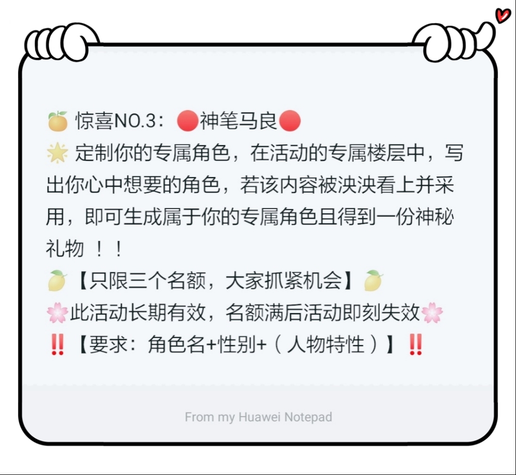 Surprise NO.3:●Magical pen Ma Liang● ★Customize your exclusive character. Write the character you want in the exclusive floor of the event. If the content is liked and adopted by Yangyang, you can generate your exclusive character and get a mysterious gift!! [Limited to three places, please seize the opportunity] 0 Your activity is valid for a long time. Once the quota is full, the activity will expire immediately!! [Requirement: character name + gender + (character characteristics)] !!