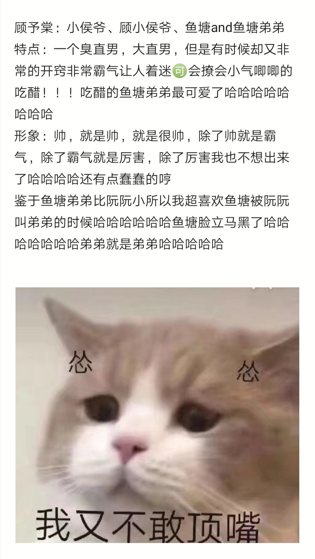 Amway's first wave, our pig's feet~ Ruan Huai: Ruan Ruan, Ruan Ruan and Ruan Xiaohuai Characteristics: Cute, with a little black belly, he can do a little bit of everything (a little bit fake), and he can also pretend to be a pig and eat a tiger~ Ruan Ruan, who is also very good at martial arts, can even be on par with his brother Yutang! ! Super handsome! A exploded! ! ! Coupled with the petite, sweet, all-around and heart-stealing thief, the fish pond brother will be eaten to death! Heartbeat~ Appearance: The cold white skin and the ice-carved appearance look super like me🉑! ! A pair of small hands and a slim waist, please let me come, I'm super 🉑! Ruan Ruan just praises us! ! ! Ruan Ruan is really super, super pretty! ! ! Love it so much! ! ! Gu Yutang: Mr. Xiaohou, Mr. Gu Xiaohou, Yutang and Yutang's younger brother Characteristics: A stinking straight man, a big straight man, but sometimes he is very enlightened and domineering, which makes people fascinated🉑He will make people jealous! ! ! The jealous fish pond brother is the cutest hahahahahahahaha Image: Handsome, just handsome, just very handsome. Apart from being handsome, he is domineering. Apart from being domineering, he is powerful. I don't want to come out other than being powerful. Hahaha. He's also a bit stupid. Since Yutang's younger brother is younger than Ruan Ruan, I really like it when Yutang is called younger brother by Ruan Ruan. Hahahahahahahahahahaha Yutang's face immediately turns dark. Hahahahahaha. The younger brother is the younger brother. Hahahahaha.