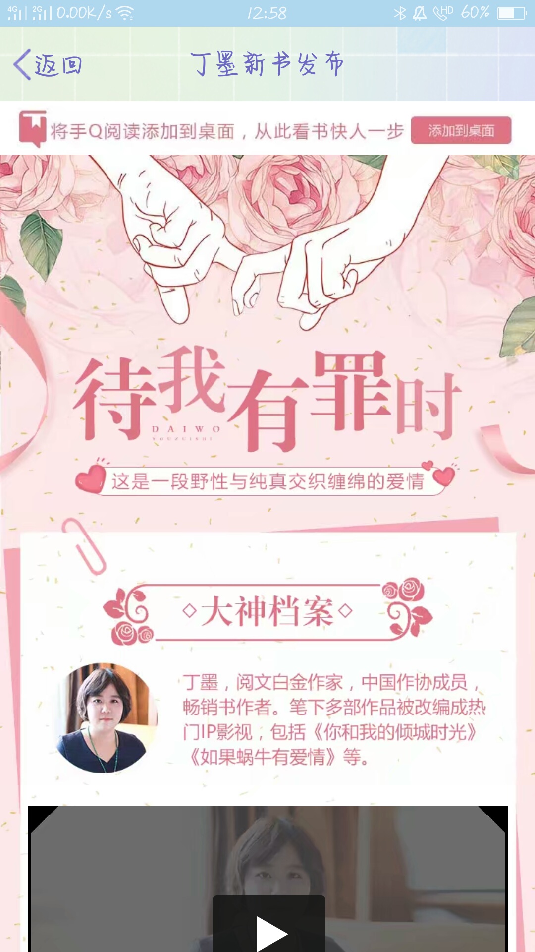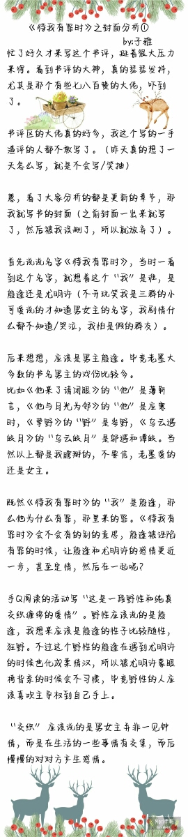 It took me a long time to write this book review, and it came under a lot of pressure. The masters who read the book reviews were really trembling, especially the one with seven or eight hundred likes. There are so many great people in the book review section that I, a lousy reviewer, don't even dare to write one. (Yesterday I really thought about how to write for a whole day, but I just couldn't write/laughed) Anthracene, after seeing that everyone is analyzing updated chapters, I will write the cover of the book (I wrote the cover as soon as it came out before, but I deleted it by mistake, so I gave up). First let me talk about the name. When I was guilty, when I saw the name, I thought about who this "I" was, whether it was Yin Feng or You Mingxu (no kidding, I only knew the names of the male and female protagonists because they were told by a cutie from the third group. I didn't know anything about the plot/I cried, I was afraid that I was a fake group friend). Later I thought about it, it should be the male protagonist Yin Feng. After all, most of Lao Mo's titles have more male protagonists. For example, the one who please close your eyes when he comes is Bo Jinyan, the one who is next to the moonlight is Ying Hanshi, the wild side of Zhiye is Cen Ye, the dark clouds meeting the bright moon are Wu Yu and Tan Jiao. Of course, I'm just making up all the above, don't believe it, Lao Mo still loves the heroine. Since the "I" when I am guilty is Yin Feng, then why is he guilty? Where does the sin come from? When I am found guilty, will there be any other meaning? When Yin Feng is falsely accused of being guilty, will it bring Yin Feng and You Mingxu closer to each other, or even fall in love, and then be together? The mobile QQ reading activity reads "This is a love that is wild and innocent." I should say Yin Feng is wild. I think Yin Feng's temperament is more casual and wild. However, this wild Yin Feng also turned into a tender man when he met You Mingxu, so he was not used to being kissed by You Mingxu blindfolded from behind the chair. After all, wild people should like to have the dominance in their hands. "Intertwined" should be said that the male and female protagonists did not fall in love at first sight, but intersected in some things in life, and then slowly developed feelings for each other. Let's take a look at the cover of When I'm Guilty. It features a heart, with a sword pierced in the heart, and the tip of the sword is a pen tip with one or two drops of blood dripping from it. And that "sin" is like being carved out with a sword, the kind that heals a little bit. Then let's guess why there is a heart and why there is a sword in the heart, and this sword is inserted in the middle (I don't understand the left and right atrium). Could it be that the person who framed Yin Feng was someone close to Yin Feng, and he was the kind who played well. Such as relatives and friends. As for the tip of the sword being a pen, I initially thought that the pen meant recording, visiting, and verifying. I didn't know who was guilty at first, but now I understand that "guilt" refers to Yin Feng. So what the pen should say is to help Yin Feng get rid of his grievances and travel to various places. I had thought before that the tip of the pen might have another meaning, which is a job like a criminal police officer. You Mingxu may be similar to Jian Yao, but of course they are definitely different individuals. Finally, there is the spiderweb-like silk web on the heart. I guess this web may mean that there will be many mysteries on the way to clearing away Yin Feng's grievances, and it may also represent the past. That is to say, this "sin" may involve a dusty past. Only by unraveling this past can Yin Feng's innocence be restored. Okay, the above show of Ziya's nonsense is over. Thank you all for watching my Luo Li Ba Suo. Thank you for meeting you in Lao Mo's new book, I love you. Finally, let me tell you that my name was really not changed for the new book. I changed it a long time ago. At that time, I changed the name because I was really European and couldn't make any koi fish. Finally, I hope to be able to make a koi carp, and maybe it will also be a talkative koi carp. Also, I hope everyone can win. Come on, come on.