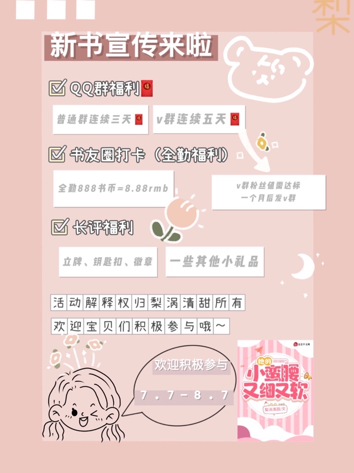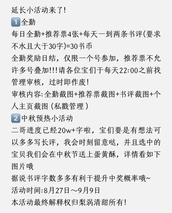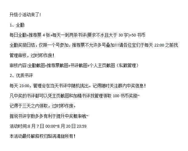 Time 10.1-10.7 12:00 (Considering that many of you are studying) The top three treasures on the weekly list will receive 300 reading coins The top three treasures on the monthly list will receive 700 reading coins Ends at 12:00 noon on 10.7 The top three treasures on the overall list will receive 1,500 reading coins (a benefit for those who support the treasures for a long time) Select 5 familiar treasures who are not on the list but look familiar to receive 100 reading coins Dear friends, you must join the QQ group, QQ group, and QQ group (say important things three times!!), Otherwise you will not be able to be contacted by the time and it will be difficult to receive the prize. I will announce it in the QQ group, and please remember to take screenshots (please try not to get stuck in time, otherwise it will be very troublesome if it doesn't match up with my screenshot). When joining the group, remember to change the group name (the same name as QQ reading should be the same~) Finally, I wish you all a happy National Day in advance! Dear friends, you can leave more messages and interact so that I can get familiar with you~ There will still be benefits when it's finished~ The redemption results are all presented in red envelopes! Little care is not disrespectful! The right to interpret the event belongs to Liwo Qingtian