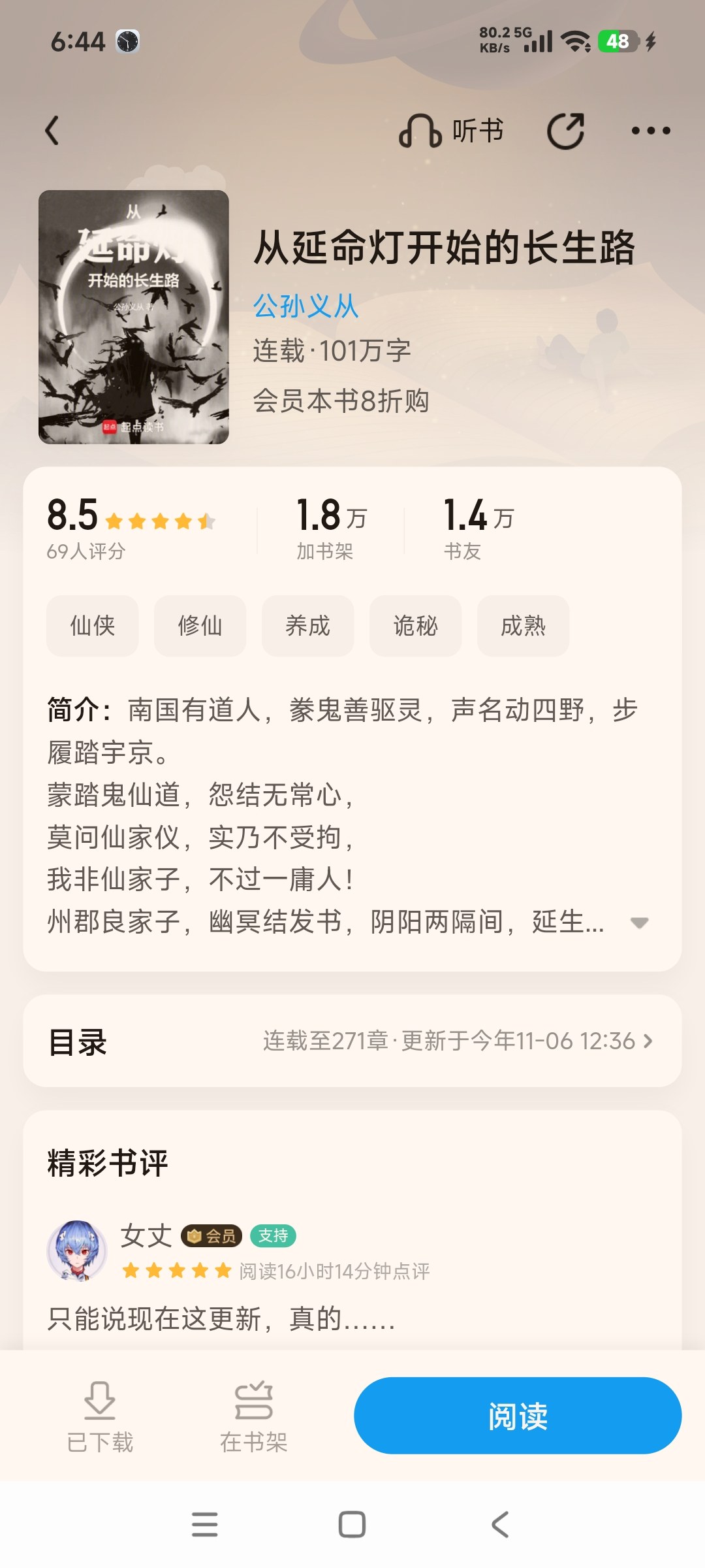 The entry point into the direction of cultivating immortals is very interesting. Paper figures protect the road, longevity lanterns extend life, and ghosts and gods in the dark sky are by the side. It can be said that at the beginning, the performance and elements of the protagonist made me interested in reading. The overall reading is very mature. Whether it is the maturity of the monastic system without being too cliché, or the grasp of the rhythm, it shows that the author has good writing experience. Especially in the release of "cool point", it is smooth, natural and expressive. In the climax of the plot, whether it is the obvious improvement in strength (capturing ghosts, obtaining magical weapons, and entering the realm of martial arts), or the author's delicate and graphic depiction of the protagonist's ability to exert his strength (summoning ghost sedans, paper man prostitutes, horned dragons), they greatly increase the pleasure of reading. In my reading experience, there are some shortcomings: the early plot of this novel is a bit bland and not attractive enough. This relatively depressed state will continue until the protagonist returns to the mountain for the first time to purchase the Paper Man Skill. After that, the rhythm becomes very smooth and mature. The second shortcoming is that when the map is subsequently changed from Tiannan to overseas, the forces that force the protagonist to change the map are not sufficiently prepared in the early stage. As a result, it is still not natural enough when reading. Generally speaking, under the two extreme trends of novels about cultivating immortals gradually turning to funny imagination or becoming retro to ordinary people, this kind of fantasy novels that maintain a relatively balanced style are relatively rare. In particular, the various charming and novel settings in the strength system are much more interesting than the crappy "Flying Sword" and "Physical Training". Among the recent fantasy novels about "side sects cultivating immortality" (such as the one in Jianpi), it can be considered a high-quality one.