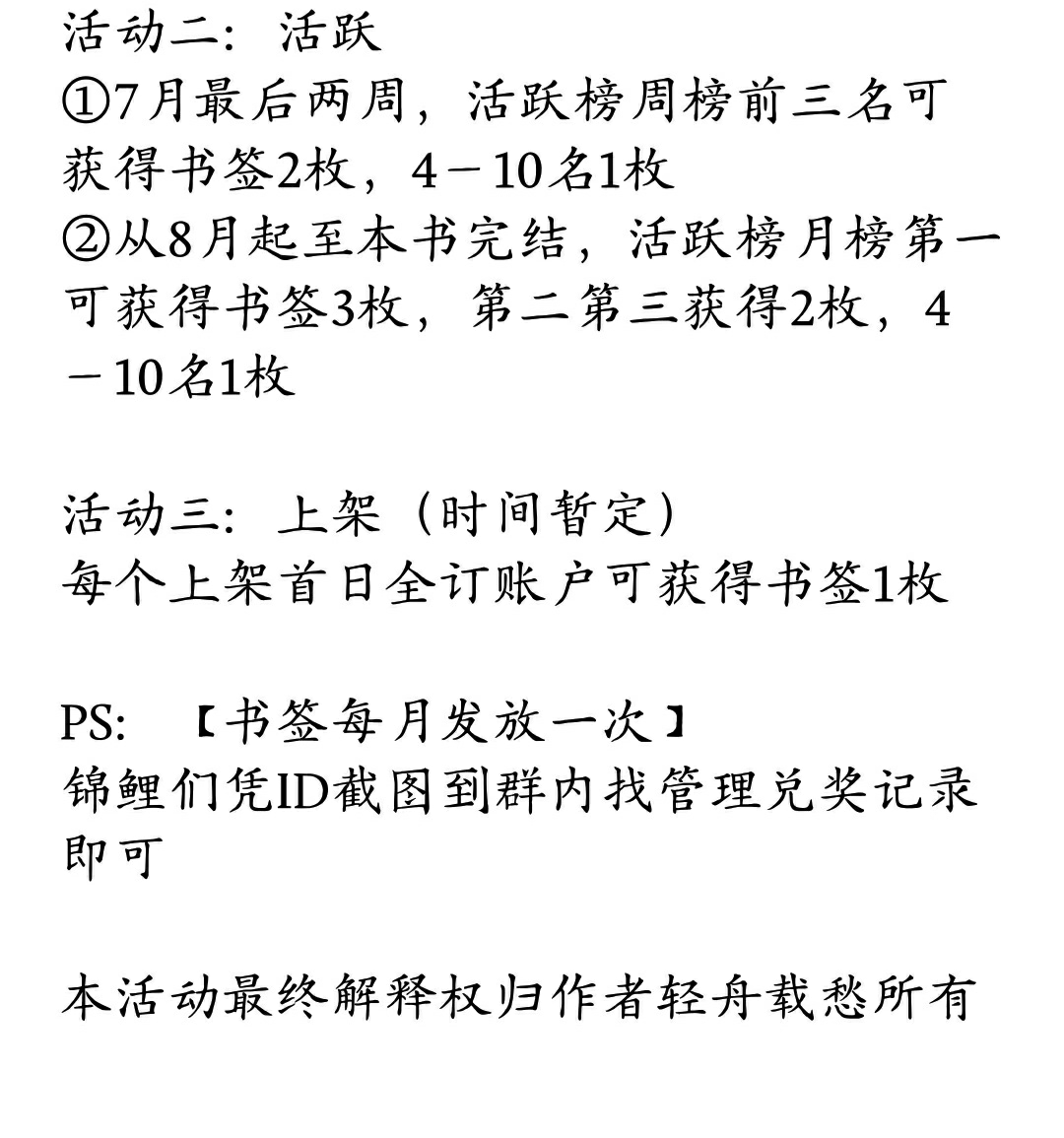 Activity 1: Step on the building ① Obtain 1 bookmark at floor 10% 20% 30% 40% 50% 60% 70% 80% 90% ② Floor 52% 66% 99% can get 2 bookmarks [A total of seven types of bookmarks will be randomly dropped (according to rolling the dice, 1-5 corresponds to 5 types, and 6 can be selected). Collecting seven types of bookmarks can summon Shenlong (Zhouzhou) Goose, Goose, and get a "mysterious gift package" (customized canvas bag, customized notebook...) (There will be some small activities to obtain after the bookmarks)] [Content of stepping on the building: cross or above, must be related to the content of this book, otherwise it will be deemed invalid] [Time to step on the building: 7.24-7.27 Midnight] [The building stamping will be held in this post] Activity 2: Be active ①In the last two weeks of July, the top three on the weekly active list will receive 2 bookmarks, and the top three on the weekly active list will receive 1 bookmark. ② From August to the end of this book, the first place on the monthly active list will get 3 bookmarks, the second and third place will get 2 bookmarks, and the 4th to 10th place will get 1 bookmark. Activity 3: Listing (time tentatively determined) Each account that fully subscribes on the first day of release will receive 1 bookmark PS: [Bookmarks are distributed once a month] Koi fish can take a screenshot of their ID and go to the group to find the management reward record. The final interpretation right of this activity belongs to the author Qingzhou Zaichou