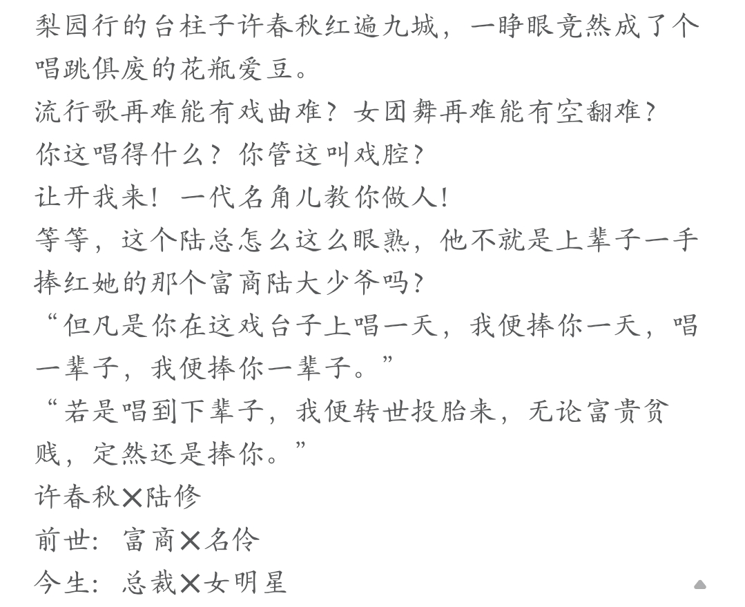 Xu Chunqiu, the mainstay of Liyuanxing, became famous all over the nine cities, but when he opened his eyes, he turned into an idol who was unable to sing or dance. No matter how hard it is for pop songs, how can it be as difficult as for opera? No matter how hard it is for a female group dancer to do somersaults? What are you singing like? You call this drama? Get out of my way! A generation of famous actors will teach you how to be a good person! Wait, why does Mr. Lu look so familiar? Isn't he the wealthy businessman Mr. Lu who made her famous in her previous life? "As long as you sing on this stage for one day, I will support you for one day. If you sing for a lifetime, I will support you for a lifetime." "If you sing until the next life, I will be reincarnated. No matter whether you are rich or poor, I will still praise you." \T Lu Xiu×Xu Chunqiu Previous life: Rich businessman × famous actress This Life: CEO×Female Celebrity