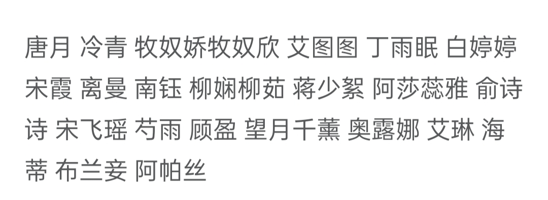 I like to see this kind of multi-heroine series. The following heroines can be used as a reference for the author. Tang Yue, Leng Qing, Ding Yumian, Mu Nujiao Mu Nuxin, Ai Tutu, Bai Tingting, Song Xia, Li Man, Nan Yu, Jiang Shaoxu, Liu Xian, Liu Ru, Astraea, Mochizuki Qianxun, Oluna, Irene, Shao Yu, Gu Ying, Heidi, Blanche Apasi.