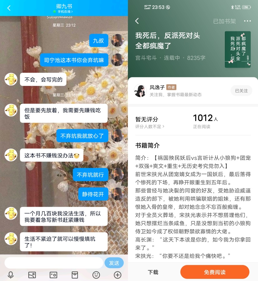 Long time no see, guys. I see that many of you are still waiting for updates. I really appreciate everyone's support and love Regarding the fact that Uncle Jiu has not updated for so long: Firstly, it is true that Uncle Jiu has just got married. For some, the balance between marriage, family and writing is still in a novice village period. Later, after the cough was relieved, family members were affected one after another. Then 23 years came, which was the first New Year after Uncle Jiu got married. There were many contacts with relatives and friends from all walks of life, so there was no update in the past few months during the wedding and New Year. Secondly, I am ashamed to say that the results of our book were not very good and the author could not make a living. Maybe for us, this is just a novel, a tool to kill time, a little hobby in our spare time, and it may not be worthy of our deposit or reward, but for a full-time author like Uncle Jiu, it is the only income, and what he eats is this bowl of rice. So, if there is no rice in a pot, or the rice is not enough, then steam another pot. I also hope that everyone can understand each other Let's answer the questions that everyone is most concerned about: Question: Will this book be continued? Will he give up? Answer: There will be more updates! Will never give up! Please rest assured! Q: When will updates resume? Answer: It's a matter of time. We will slowly fill in the gaps later in this book. There is no specific time yet. *Most importantly, Uncle Jiu has opened a new book in Yangshizi! ! ! I just opened the article yesterday and it's still hot! It's still the familiar flavor to us! Worth the call! ! ! I hope everyone will support me if possible! After all, only our support is the author's most original and effective motivation! Bow 90°jpg. Finally, I would like to thank you all again for your support and love. I hope you will no longer be obsessed with this book and let us wait for the flowers to bloom *Attached are the chat records between myself and Uncle Jiu and Uncle Jiu's rice bowl at Yangshizi! (Note* The chat record only intercepts the main part of the chat. However, I talk a lot of nonsense, so the interception is not all )