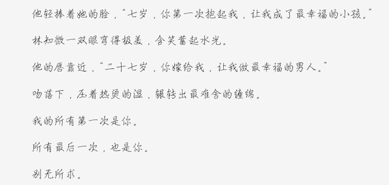 This book is very sweet, really, it touches my heart! ! ! ! ! Lin Zhiwei and Lu Xinghan grew up together and supported each other. Although they encountered ups and downs and hardships along the way, there was a mother who abandoned Lu Xinghan, an uncle's family who treated him badly like vampires, and a patriarchal grandmother who poured water on her just before she died, and even suppressed Lu Xinghan for her son. Mr. Liang, the greedy Director Zhao, Chen Lingyi (it should be her), etc., As well as academic turmoil, etc., But Zhiwei and Xinghan also met teachers and friends who were worthy of their company, and had a warm daily life. After the difficulties, the weather will eventually clear up. In the end, they got married, received the certificate on Lu Xinghan's birthday, and got married on Lin Zhiwei's birthday. Probably the most beautiful love is like this. You grow up with me and I grow old with you. The years we spent together are ultimately the most beautiful memories. I only hope that the intervening decades can pass slower and slower, and let me stay with you for a long time and never end. All my first times are with you The last time of all, it's you Want nothing more Finally, my confession is huge and well written (✪▽✪), come on! ! ! ! ! ! ! ! ! (I really like Lao Xue and Zhi En!!)