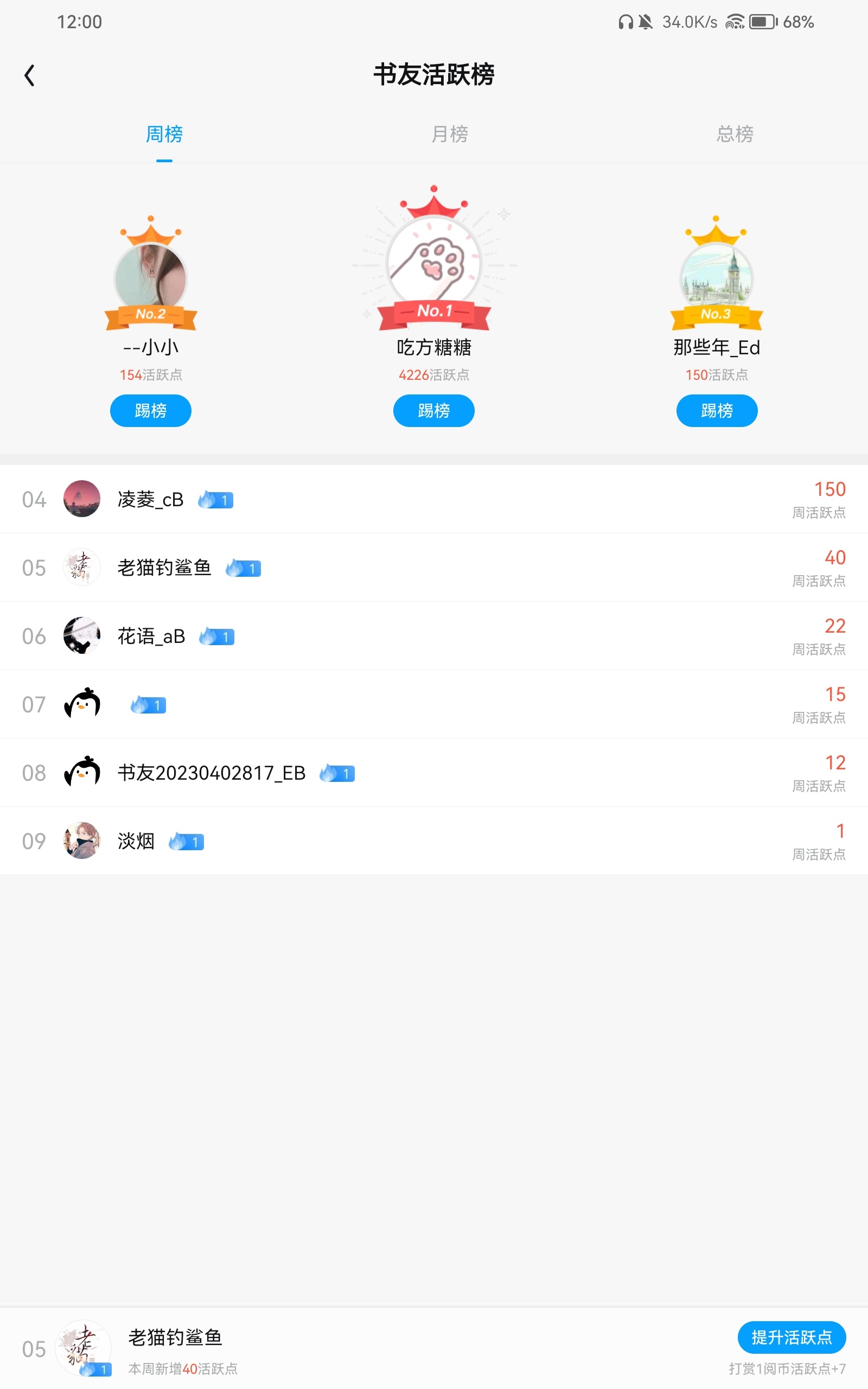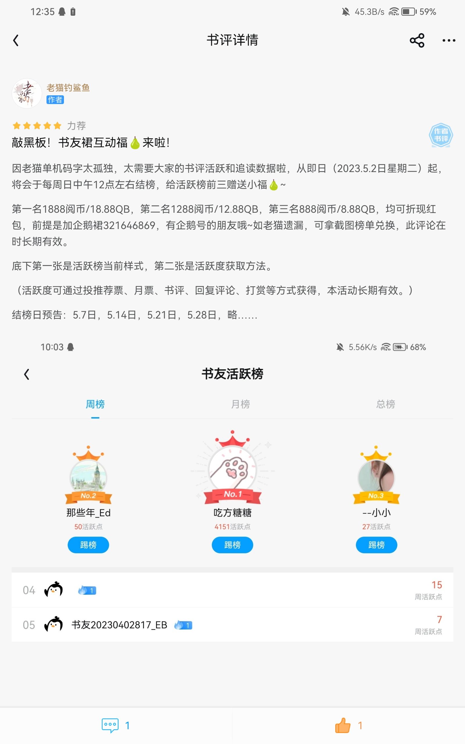 Because Laomao's single-machine coding is too lonely, and we need everyone's active book reviews and reading data, starting from today (Tuesday, May 2, 2023), the list will be compiled every Sunday around 12 noon, and the top three active list will be given a small blessing🍐~ If Laomao misses it, you can redeem it with the screenshot list. This comment will be valid for a long time. [Due to Laomao's busy schedule, this event will be the last on May 21st. Thank you for your support and encouragement. Please pay attention to the event time] The first picture below is the current style of the active list, and the second picture is the method to obtain the activity level. (Activity can be obtained through recommendation votes, monthly votes, book reviews, replying to comments, rewards, etc. This activity is valid for a long time.)