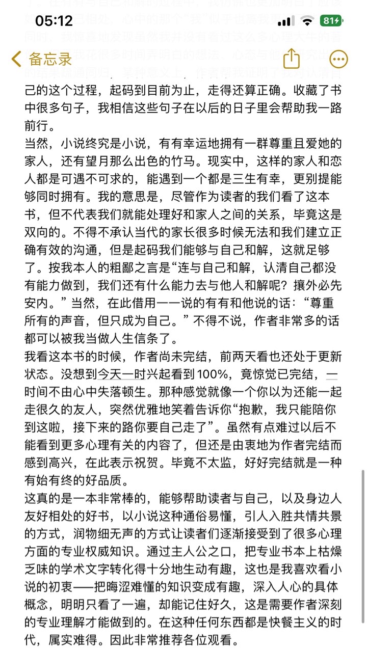 This book is well written, and it is an inspiring book. The heroine described by the author is very gentle, and she lives a very transparent life. Although he only became so good after experiencing a lifetime. But some people may be persistent and stuck in the same place. Life may not be as beautiful as we imagine. In fact, how much of life is really what you imagine it to be. Maybe letting go is a good choice, but many times, you can't help it. When I saw the author's description of their psychological problems in life, I felt the same way. Many times, most people don't understand and think it's hypocritical. In fact, it's not the case. If they could listen more and feel more, there wouldn't be so many bad things happening. They are just sick, but not in the traditional sense. Life is really short, don't put too much pressure on yourself, I know everyone wants to be good and outstanding. However, there is still a lot worth experiencing and encountering in the world. Study hard and live well.