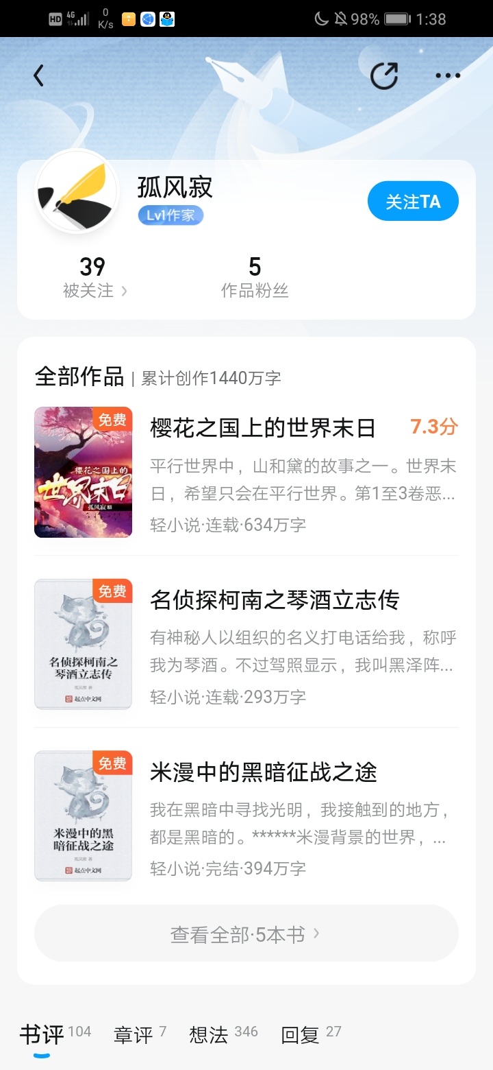 I just took a look at his. Page. A total of 14.4 Million words were created. Among the several novels, the minimum is 130,000 words, and the maximum is more than 6 million words. Close to 7 million. And the interface has less than 100 followers of the work, only five of them. If you don't believe it, here's a picture. Poor baby. Moreover, before I commented, there were only nine comments displayed in this comment area. This novel has more than 3 million words, and the nine reviews are simply incredible.