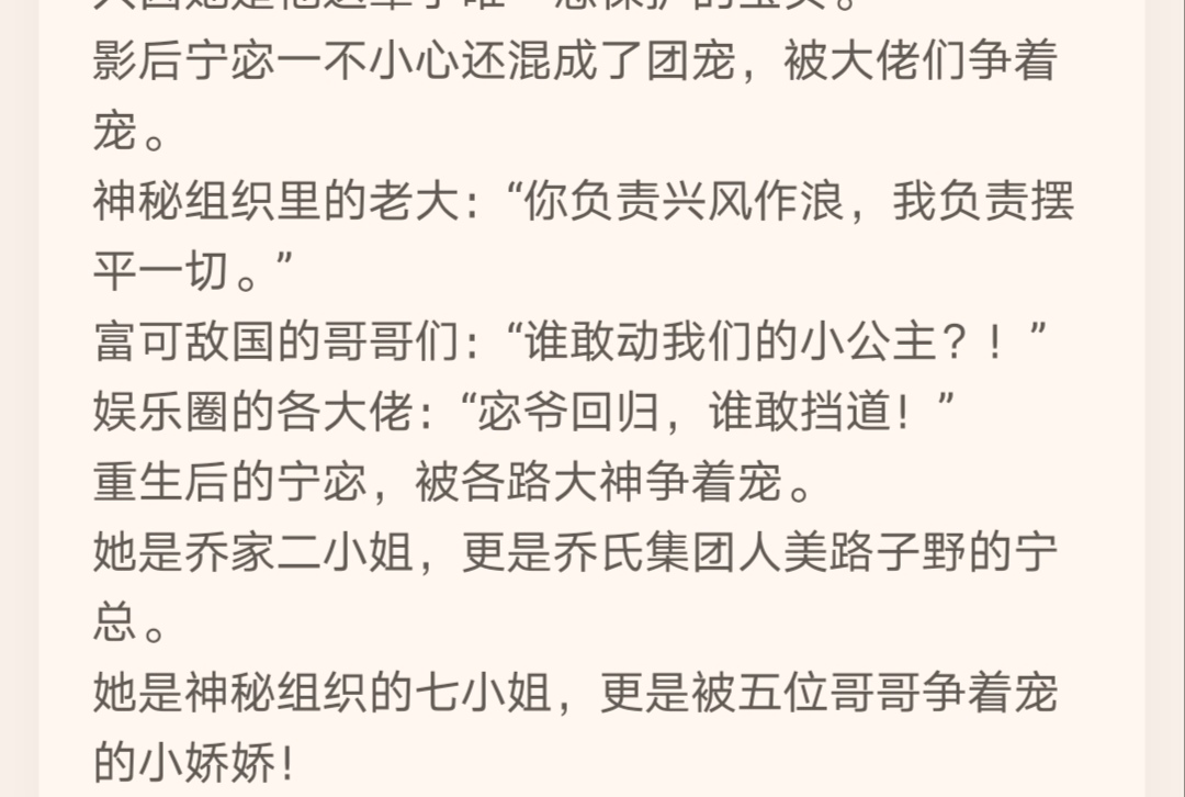 [Rebirth of a scumbag + group pet vest + Su Shuang super pet 1v1] In the previous life, Ning Mi was conspired by scum to die in the cold sea water, and no one cared about her. In this life, she transforms into the beautiful and sassy second lady of the Qiao family to take back everything that belongs to her! At the dinner, the powerful Crown Prince of the Gu family fell in love with her at first sight, "I like you and I want to marry you." "Master Gu is so domineering. If you like it, do I have to marry him?" "Of course!" The crown prince of the Gu family was harsh and cold, but he was only gentle, considerate, and flirtatious to Ning Mi. Ning Mi was short of money, so he gave her a black card that can only be obtained by the world's top richest people. Ning Mi likes acting, and he helps her reach the top of the box office. When Ning Mi was in danger, he had to protect her regardless of his own life! Just because she is the only treasure he wants to protect in his life. The movie queen Ning Mi accidentally became the group favorite and was vying for favor among the big guys. The boss of the mysterious organization: "You are responsible for making trouble, and I am responsible for settling everything." Brothers who are extremely wealthy: "Who dares to touch our little princess?!" Big bosses in the entertainment industry: "Master Mi is back, who dares to stand in the way!" After rebirth, Ning Mi was vying for favor from all the great gods. She is the second young lady of the Qiao family, and she is also President Ning of the Qiao Group's Renmei Luziye. She is the seventh young lady of a mysterious organization, and she is a little Jiaojiao who is being loved by her five brothers! She is the darling of the fashion industry and a powerful actress who has reached the top of the entertainment industry! She also wants to keep a low profile, but her strength doesn't allow it~