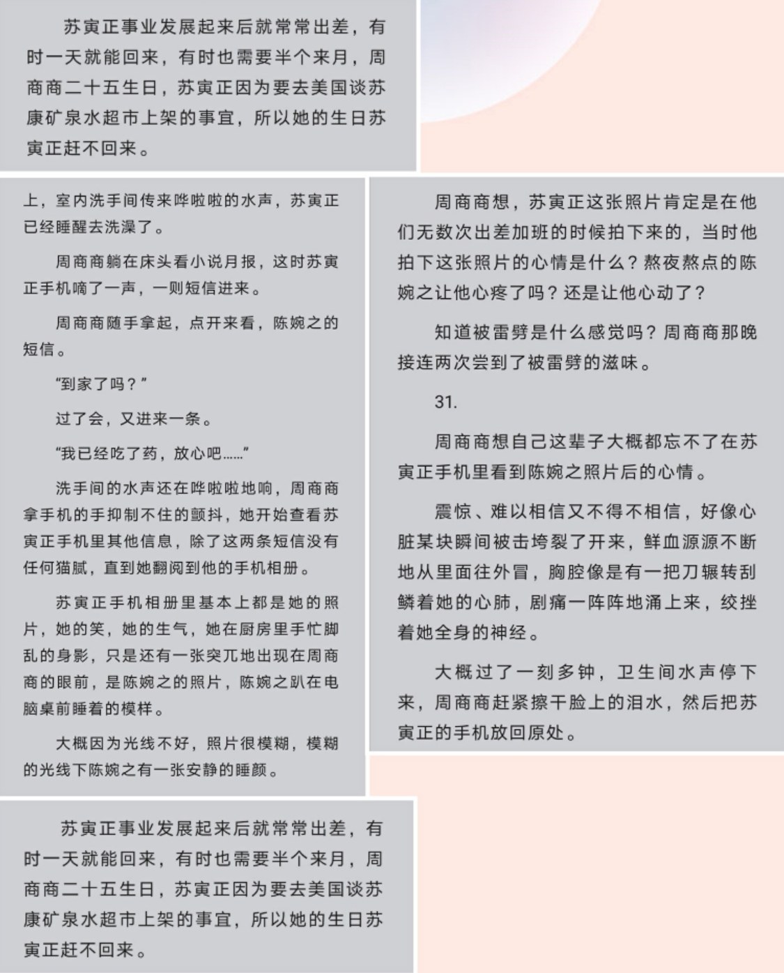 1⃣Shang Shang is good to her husband! Shang Shang accompanied Su Yin Zheng through the hard times in Beijing. He lit the stove in winter, washed clothes by hand without a washing machine, and his hands were red from the cold... He accompanied him in the best years of adversity without hesitation. Shang Shang really gave everything he could to Su Yin Zheng. 2⃣Shangshang was also very kind to her mother-in-law. She thought the sofa was too hard and persuaded her to change to a softer one. He also bought her a pillow, saying it would be softer! 3⃣Shangshang is a very good person and kind-hearted! In Beijing, for example, when Han Zheng came to Shang Shang and Su Yinzheng's home, she would politely make tea for the guests and even go out to buy fish! (The hospitality is very good) During the trip in Yunnan, I rescued the girl who was abducted by human traffickers. Some people say, why did Shang Shang look for Han Zheng as soon as he got divorced? Me: I feel hurt by the person who loves me, but I also want to be loved and warmed by others! Her parents are dead and grandma doesn't want her. Where can she go? In the three years since Shang Shang got married, Su Yinzheng had never touched her. The older woman stayed alone in a big villa every day (some of her parents died during thunderstorms, and she was particularly scared when she encountered such weather alone). Some people say that Shang Shang coldly brutalized Su Yinzheng? Shang Shang was keeping a secret for him, but he was messing around with women outside, and his body was not clean! Let me ask you, don't you mind if your boyfriend is having sex with another woman outside? It's not cold violence. Thinking about my husband cheating on me makes me feel uncomfortable. Some people say that Shang Shang is still married to Su Yinzheng? I met Su Yinzheng when I was 11 years old. They were childhood sweethearts + campus love + a couple in need! The best companionship and perseverance, no one would be willing to leave it to anyone. The male protagonist is a cheater both physically and mentally, and he is tempted to cheat on Chen Wanzhi! Later, she had constant ambiguities with different people, and later she kept a female star (female stars are people who often appear in movie theaters and on TV, and businessmen feel alienated every time they see and think about them) I felt sorry for my secretary. Later, I went on a business trip with my secretary and didn't come home for more than ten days. All the photos on my phone were of the secretary's smile! Clearly and clearly cheating (see picture below) Shang Shang even thought about committing suicide during her marriage, but luckily Han Zheng was there to comfort her! Han Zheng is really nice to Shang Shang, both before and after marriage! It's almost a lifelong pairing that girls hope for. There are many "Su Yin Zheng" and "Zhou Shang Shang" in the world, but very few "Han Zheng"
