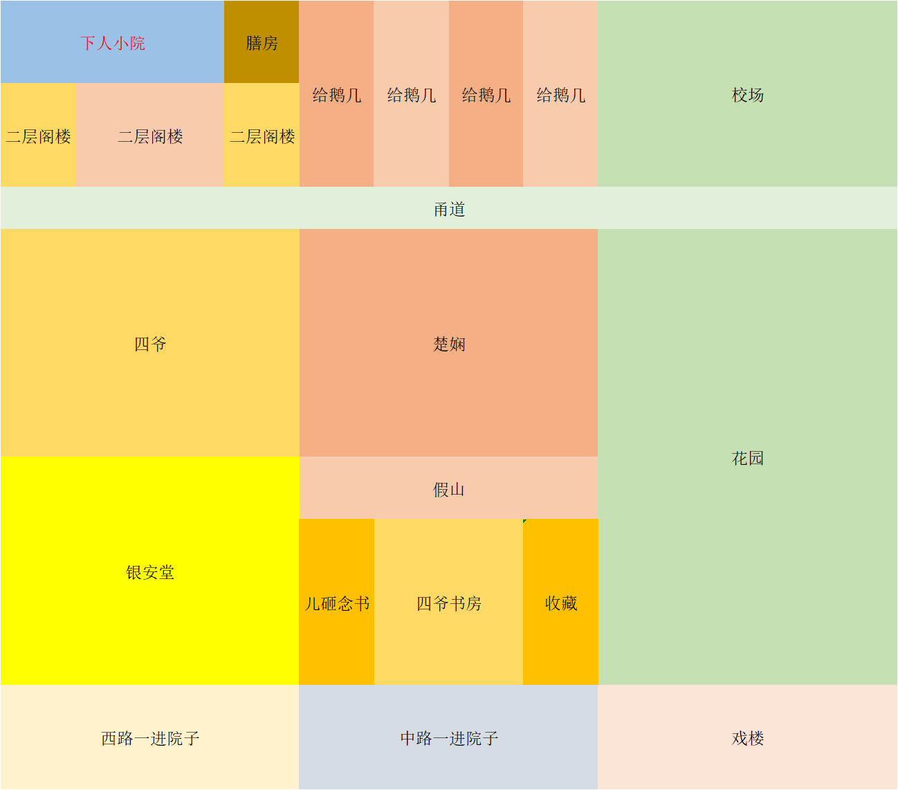 Look at the picture (´-ω-`). The main entrance is on the south wall of the courtyard as soon as you enter the west road, and the main gate you usually use is on the south wall of the courtyard as you enter the middle road. The specific appearance of the gate refers to various costume TV dramas. Those who are interested in Yonghe Temple or Prince Gong's Mansion should know about it. As soon as you enter the courtyard, you will find the gatehouse, where the servants live. The government's chariots and ceremonial guards are usually here. Chu Xian's yard is very big, and there are many rooms in it, so I won't mark them out one by one. My daughter can live with Chu Xian or in the embroidered building in the garden. In the middle of the garden is a lake, with lotus flowers planted in the lake, and a boat on the lake. In the garden, there are mountains, water, flowers, stones, pavilions, and flower houses. The school ground is a place for the fourth master and his son to ride on horseback and shoot. The second-story attic on the west side is the large warehouse of the mansion. Chu Xian also has her own small warehouse in the yard. The four courtyards prepared for the sons in the north are not occupied yet. Guests can stay here when they come. Yin'an Hall is the second entrance to the courtyard on the west road. It is very big and has no people living there. Banquets and other events are held here. When the Fourth Master is granted the title of County Prince or Prince, Yin'an Hall will be renamed Yin'an Hall. By the way, the Fourth Master originally planned to have four sons, but not a daughter, hahaha. Then, the fourth master didn't prepare a place for his concubine to live at all haha╰(ಡωಡ)