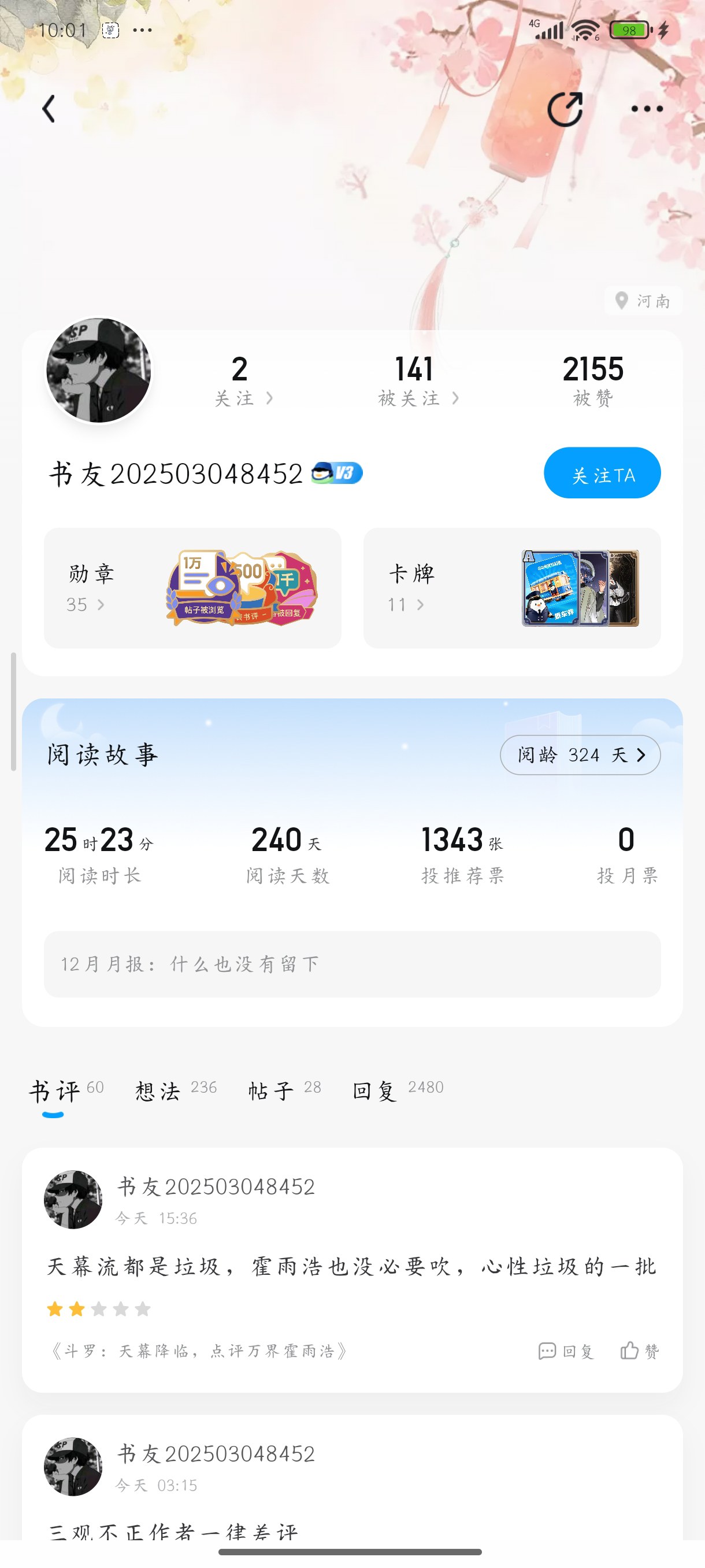 I really can't stand it any longer, this guy, more than 300 days old, 25 hours of reading time, all the damn two-star reviews, some books have not even been read for a minute, and in this book, you can still find his comments, and he is fucking whitewashing Tang San, saying that as long as Tang San wants, Douluo Continent is his back garden, 666, 4 of the 5 law enforcement gods died, and only Tang San is left.