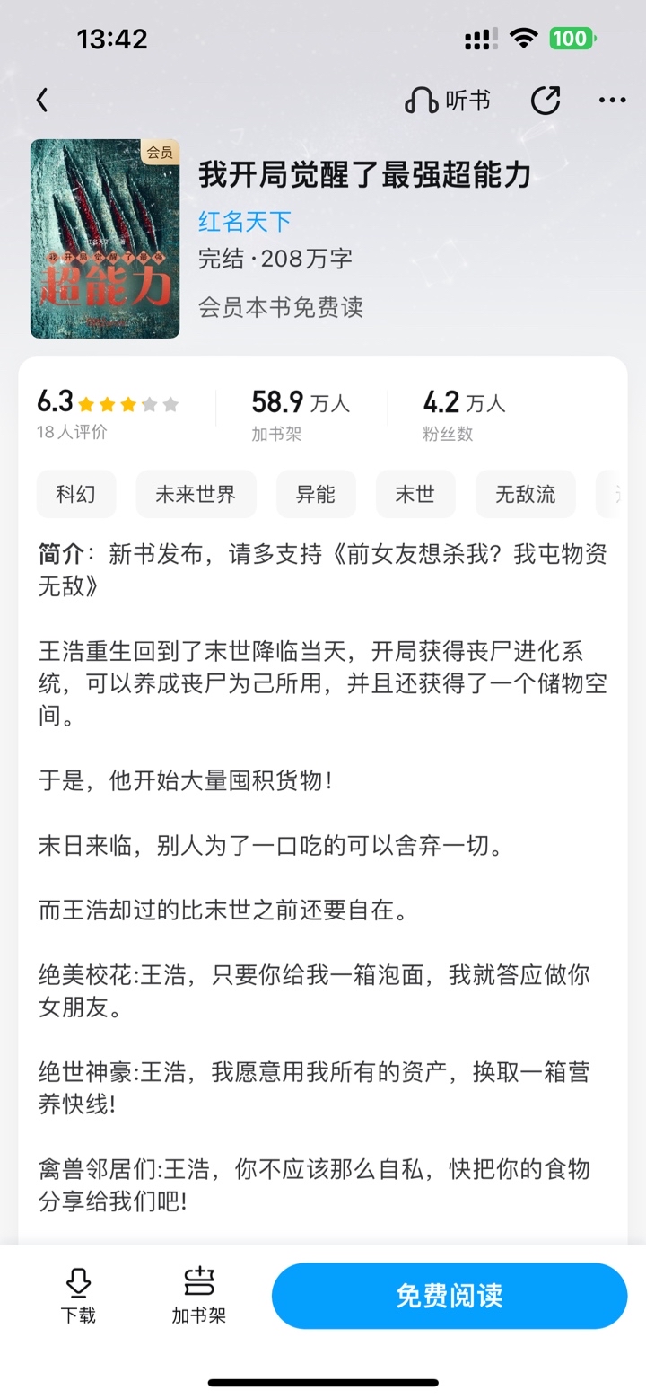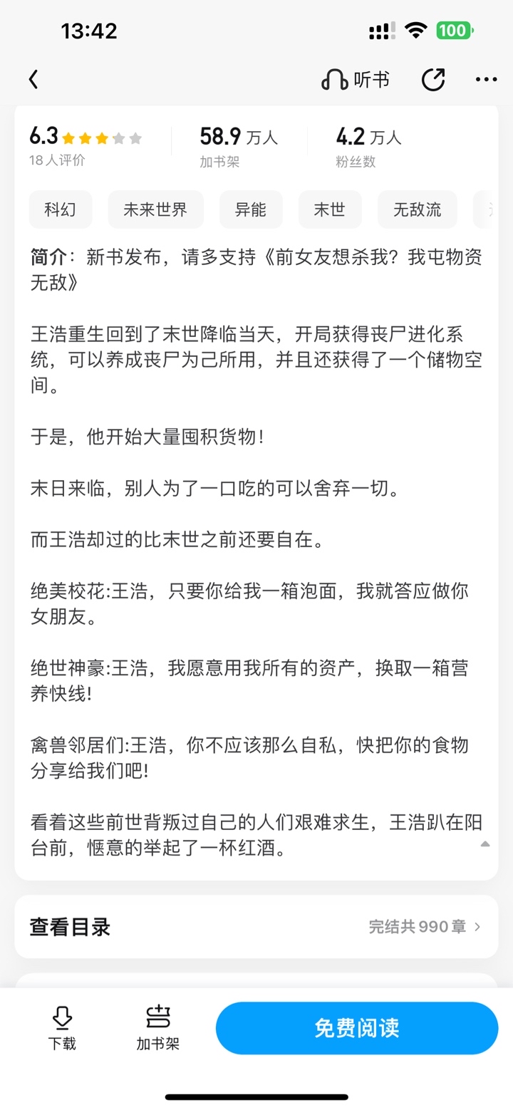 Wang Hao was reborn and returned to the day when the apocalypse came. At the beginning, he got a zombie evolution system, which allowed him to cultivate zombies for his own use, and he also got a storage space. So, he started hoarding goods in large quantities! When the end comes, others will give up everything just for a bite to eat. But Wang Hao is living more comfortably than before the end of the world. Beautiful school belle: Wang Hao, as long as you give me a box of instant noodles, I promise to be your girlfriend. The peerless hero: Wang Hao, I am willing to use all my assets in exchange for a box of Nutritional Express! Animal neighbors: Wang Hao, you shouldn't be so selfish, share your food with us! Seeing these people who had betrayed him in their previous lives struggling to survive, Wang Hao lay in front of the balcony and raised a glass of red wine in comfort.