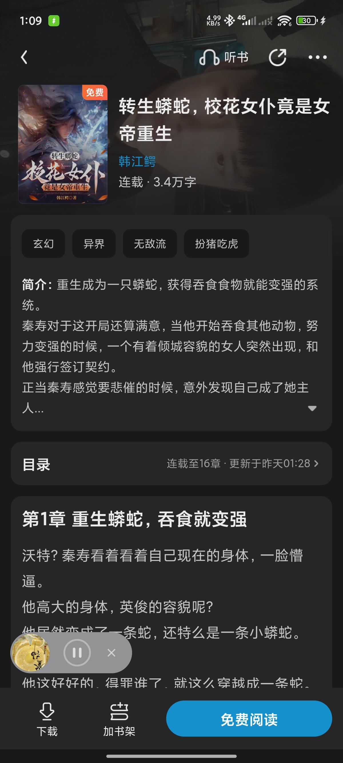 Reborn as a snake, the system becomes stronger when it is swallowed. Qin Shou looked at the frozen world in front of him, and the corners of his mouth twitched slightly. He just traveled through time and space, but why did he end up in a frozen apocalyptic world around the world? In this world of ice and snow, there aren't even any mosquitoes, so where are they going to devour them! ? What's more, he was about to freeze to death! When he was unconscious, Qin Shou saw a tall figure appear in front of him and put him in his arms. ......... My name is Su Qingran. I was the empress of the human race in my previous life. After experiencing the global ice apocalypse, the high temperature apocalypse, the zombie apocalypse, the gravity apocalypse and the material dissociation apocalypse. Near the end of Behemoth Apocalypse, he died fighting a level nine Behemoth. When I am reborn at the age of eighteen, I must build a constant-temperature base as soon as possible to survive the ice and high temperature apocalypse. While out searching for a missing treasure chest, he unexpectedly encountered a frozen snake. I wanted to take it back to make snake soup, but unexpectedly it suddenly came to life! And he was so vindictive that he even bit my foot twice in a row! Forget it, since it's alive, just keep it as a little pet. But who would have thought that this snake has such a huge appetite that it ate all the food I had stored for half a year in just one month! Not only that, it would also crawl into bed to sleep with me at night, and even asked me if I had ever heard the story about the farmer and the snake. Bah! "My name is Su Qingran. In this life, I seem to have been slept by a snake..."