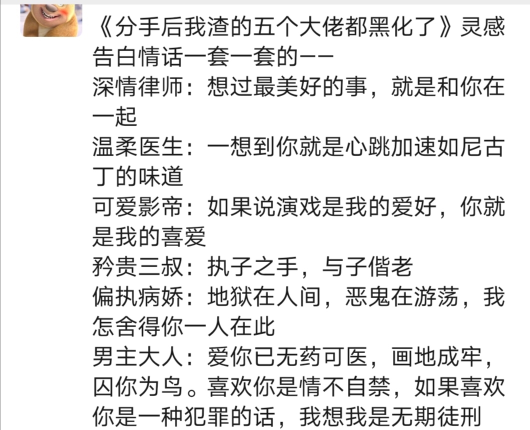 No. 1 Dog's affectionate lawyer Ji Simo✨ "The best thing I have ever thought of is to be with you." "If liking you is a crime, I think I will be sentenced to life imprisonment." This is a dog with a gentle and animal appearance~ No. 2 Dog perverted actor Shen Yibai ✨ "If acting is my hobby, you are my hobby." "Shengsheng, if you die, I will accompany you" "They are with me in life, and my bones are eaten away in death." Get to know the super perverted dog~ Keep people no matter what the cost Fu Sinian, the paranoid and yandere dog No. 3✨ "Hell is in the world and evil spirits are roaming around. How can I let you be here alone?" "Those who have pursued sunshine will not bother to be in hell. You are the light and the only one." This is a very annoying bitch~ No. 4 Dog Zi Jingui Third Uncle Mu Mo ✨ "Hold your hand and grow old together." "We should live together in the same room when we are alive, and we should live together in the same year and month at the same time when we die." This dog's abnormality is not only on the surface but also on the inside, which makes people's scalp numb. No. 5 Dog Wen Runian✨ "When I think of you, my heart beats faster. The taste of nicotine." "For the rest of my life, I will be filled with joy if I have you. If I am stubborn, I will be happy. You are enough." From time to time I would take out a scalpel from my pocket, and every moment I would think about the dog that broke classmate Jiang's leg~ Perversion is due to his true nature, and it can be seen on the surface. (The love stories of the five dogs are already in place. They were all compiled according to their personalities. They were all thought up when I started the book and were not found online. Enter the completion stage as soon as possible, there will probably be... A lot more, right? ! )