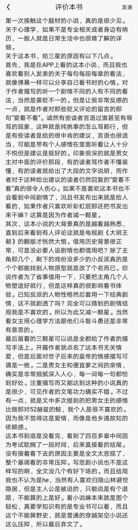 There are spoilers, so be careful. This is one of the most depressing stories I have ever read, in the top three. Repression is not torture, it is blockage, and there is almost no release. After reading it, I was very impressed and it was considered amazing. Friends can give it a try. At the beginning, a conspiracy brought the heroine and her family into the palace. After various plots, twists and turns, jumping back and forth between hope and despair, the heroine and her family escaped from the palace in the end. Is the loop closed?~ The plots, including healing and rescuing people, love and hatred, plotting, etc., Are quite depressing. Each of them will have or be accompanied by a disappointing result: some patients will get better during the treatment, but the patient will still die in the end. It is not clear whether that is misery or relief. In some cases, love gradually turns sour and forms shackles, and the beauty of the past is actually the cage of today. In some cases, power's plans finally succeed, only to be trapped by them. In short, the best ending is to return to the starting point. The whole article is finished, it feels like a wasted effort. I was so confused... Well, later I read the author's definition of "feeling" and finally understood: the feeling of feeling good for us ordinary people is dopamine, while the feeling of feeling good for the author is probably endorphins. There is a big difference. But this is not a strong female essay either. The heroine was beaten and struggled all the way, resisting with the intelligence and forbearance of ordinary people, and with the tough mind of a psychologist, she kept fighting and fought repeatedly, until she couldn't stand anymore and begged for death, and was let go by the men who had been obsessed with her. That's right, he let him go, not that he successfully counterattacked. So I felt like this was an abusive article. 1. There is no moment in the whole text where the protagonist can dominate his own destiny. They are always in the control of others. It's like a person had a difficult and long nightmare, almost died in this dream, and finally woke up, there was no joy, only a return to peace. There is no reaching the top to control your destiny, no beautiful man in your arms or gold and silver mountains, no success, only getting back to an ordinary life. But just like that, it consumed all the energy. 2. The article connects one sad and bleak life to another, and I can hardly find a point of release. Lin Jieyu's death was too light to make people happy. The death of the imperial concubine - her choice was so reasonable that it made people unable to vent. The cause of Queen Zhen's death was so disgusting that she was even more angry and hated. And the outcome that cannot be changed will only make people aware of their own weakness. The fate that cannot be overcome is like a giant wheel running over the heart, making it even more blocked. Only when Shi Shiyi was lying on the carriage reading the letter with injuries all over his body, and when I realized that it was finally possible for someone to escape from this shackles, did I see a little hope, and could I really cry and be released. Otherwise, I would be depressed after reading this novel. 3. Follow the protagonist's perspective and see that the world is almost filled with endurance and struggle. It feels like: She can discover a new annoying point in the world every day, and clearly understand the reason for their existence; and then insist on finding a good point every day to remind herself that the world is okay and can be changed. Or she uses her psychological knowledge to regulate her emotions and relieve pain and despair when she is in pain. Just like the man mentioned in the article who pushes stones day after day, in vain. Although the article also mentions a theory that the "man pushing the stone" can also be the happiest person, the perception from the heroine's perspective is more like that of the futile person. She tried in vain to remain a bystander in this world, in vain to seek understanding, in vain to save the patient, in vain to save herself, in vain to die, and finally the whirlpool of fate stopped playing, and she raised her hand compassionately and let her go. And almost everything she did based on her personal free will was in vain. I have never seen such a sadistic perspective of the protagonist. I often think that if she had been willing to join this world and become more deeply involved with it, maybe there would have been a different ending. For example, as soon as Queen Zhen died, she went to kill Lord Hengyuan. But her perception of her identity is different. She is a psychologist, and she faces patients or this sick world. Therefore, she spontaneously remained on the sidelines. I've never seen this type of abuse. Everyone else is a bastard, and the fate of the protagonists is caused by a combination of circumstances. The protagonists fail to get what they want or torture each other. At least, in the process of the protagonists abusing each other, they gained something, such as getting revenge, such as causing a big misunderstanding. But this article, I don't misunderstand you, it's not bloody. It just makes the protagonist struggle from beginning to end, and it's all in vain. This is really unprecedented. But none of this affects my love for The Psychologist. This is a good article. The tense start at the beginning is curious, but the concubine's slow treatment makes people anxious. I really want to think about it, if the imperial concubine should give Qu Xiu and the old lady a good beating, get rid of them first, and then realize that "if you don't want to be an imperial concubine, you can consider becoming a dowager". However, the plot gradually made me understand that it is not enough to simply tell the patient "You go and do this" or "You do this and that", because she may not listen at all. Her core collapsed, just like you said to a pi