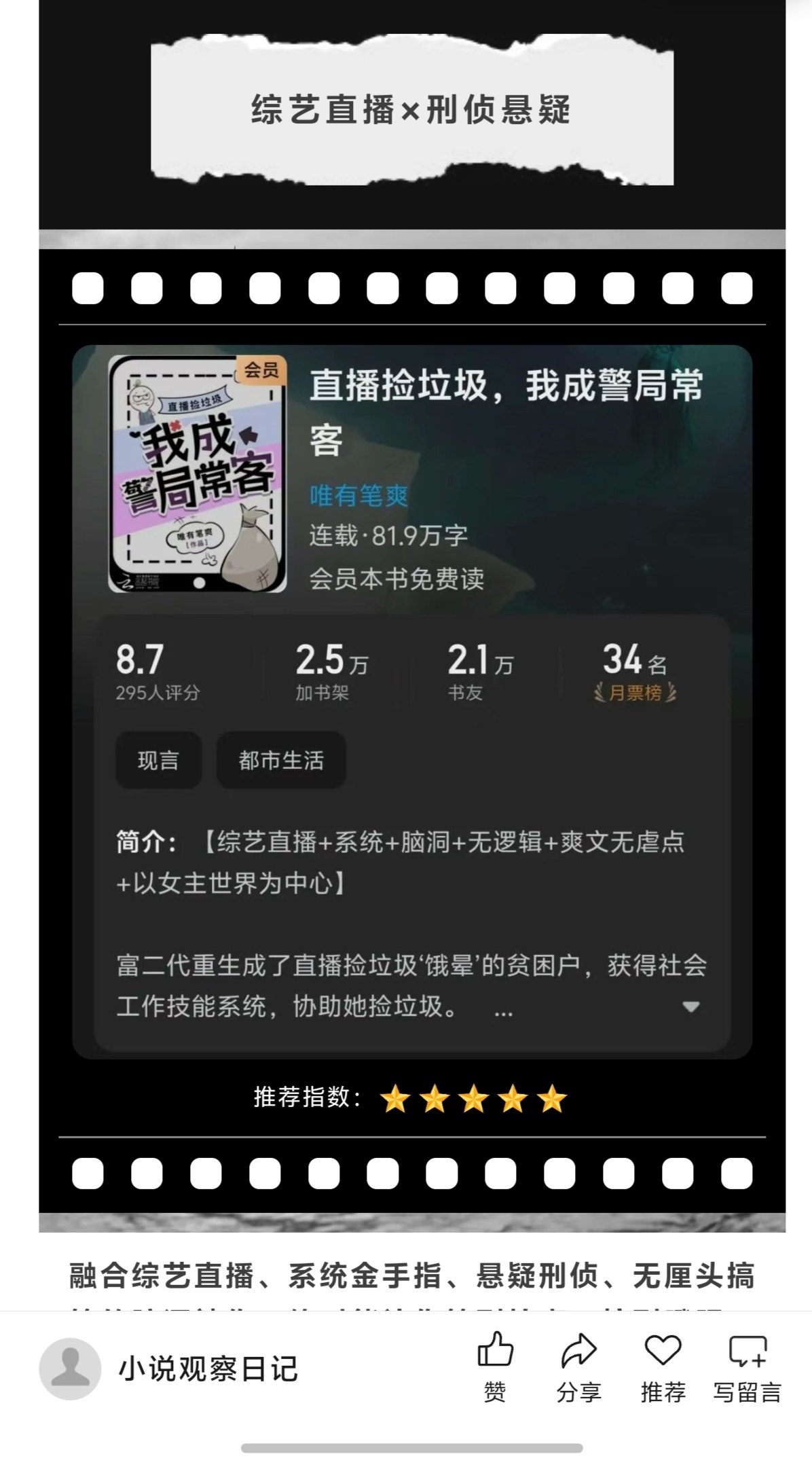 [Variety show live broadcast + system + imagination + no logic + cool writing without abuse + centered on the heroine's world] A second-generation rich man was reborn as a poor householder who "died out from hunger" during a live broadcast of picking up rubbish. She received a social work skills system to assist her in picking up rubbish. [Ding, valuable items detected...] Jiang Xiaoya was so angry that he pulled out the trash can on the spot, dug out a black plastic bag, and then... Pulled out a human head. The police reward is 2,000. [Ding, valuable items detected...] Jiang Xiaoya threw down the big bowl and went out to dig through the trash can. The aunt fought with her for the trash, and a big palm fell out of the plastic bag, almost sending the aunt away. The police reward is 2,000. [Ding, valuable items detected....] Jiang Xiaoya, who had just walked out of the police station and was still at the door of the police station: "..." She suspected that she had been tricked by the system. Netizen's perspective. At first I thought this was stupid. Who is a good person who picked up garbage for three days without earning a cent and made himself faint from hunger? Unexpectedly, someone pulled out the trash can and pulled out a human head, which alerted the police station. Good guy, if we don't open for three days, it will take half a year for the aunt to pick up paper. It wasn't until she picked up the stump for the third time that the whole network became uneasy! This is not a stupid sister, she is clearly one of the great fortunes of the ancestor.